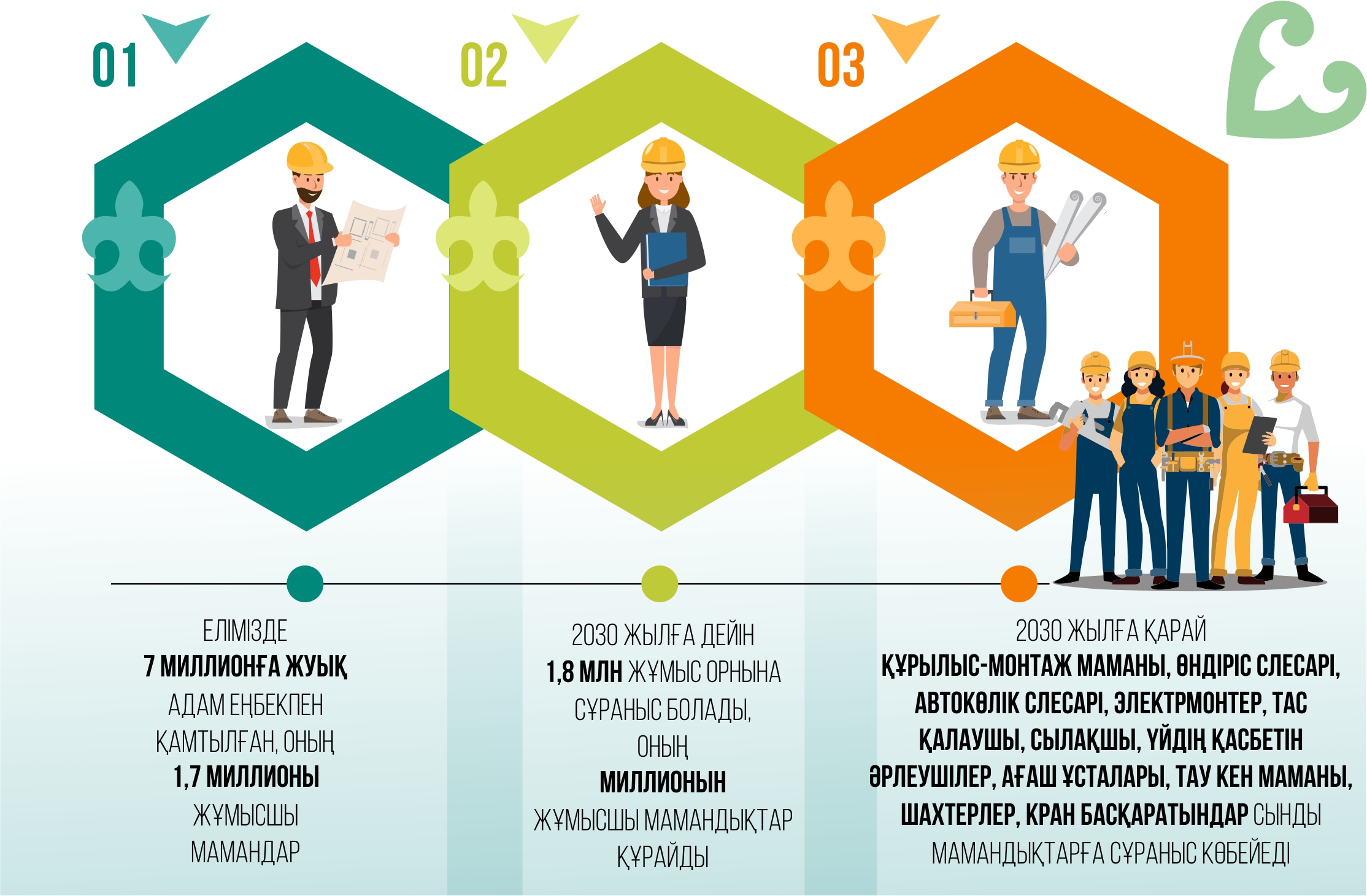 Білім мен еңбек нарығында жұмысшы мамандықтарының беделін арттыруға ерекше көңіл бөлінді. Мемлекет басшысы 2025 жылды «Жұмысшы мамандықтары жылы» деп жариялады. Қазіргі таңда колледждер мен оқу орталықтарында техникалық мамандықтарға қабылдау көлемі артып, дуальды білім беру жүйесі кеңейтілді. Кәсіпорындармен ынтымақтастық нығайып, жастардың өндірістік тәжірибеден өту мүмкіндігі кеңейді. Бұл бастама еңбек нарығындағы сұранысқа сай мамандар даярлауға жағдай жасап, ел экономикасына қажетті кадрлар қорын қалыптастыруға мүмкіндік берді.