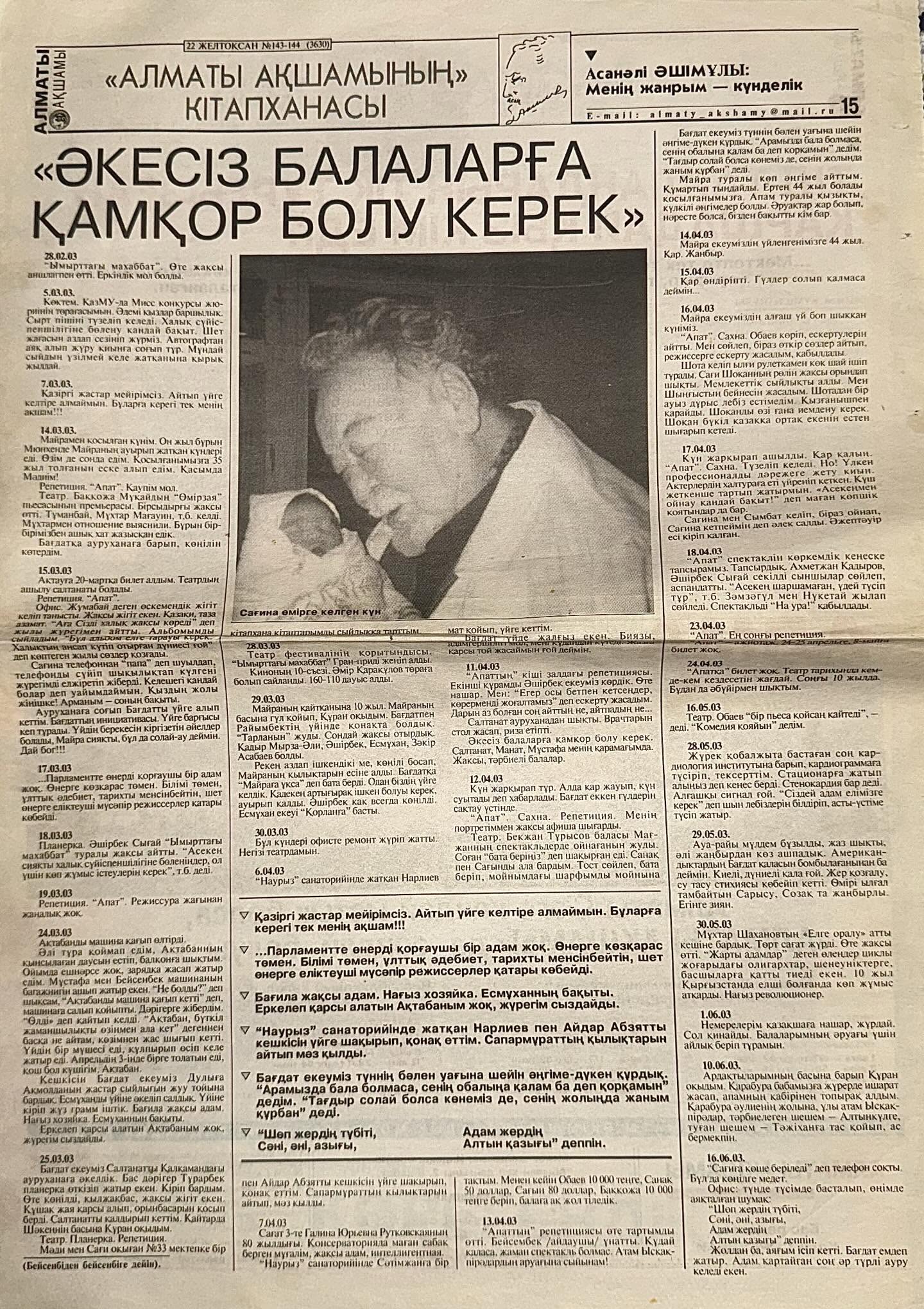 "Бүгін әкемнің артында қалған естеліктерді ақтарып отырып, көзімде мұң, жүрегімде сағыныш. Архивте сақталған газеттерді қайта қарадым.