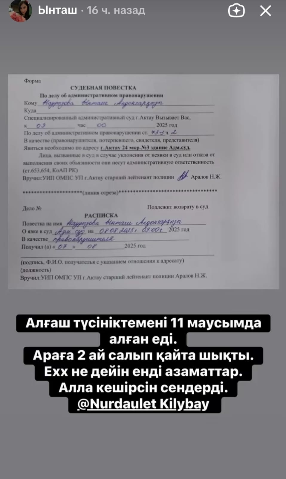 ТикТоктағы рилсінде Ынташ Наурыз өзіне әкімшілік жаза бойынша соттан шақырту қағазы келгенін жариялап:
