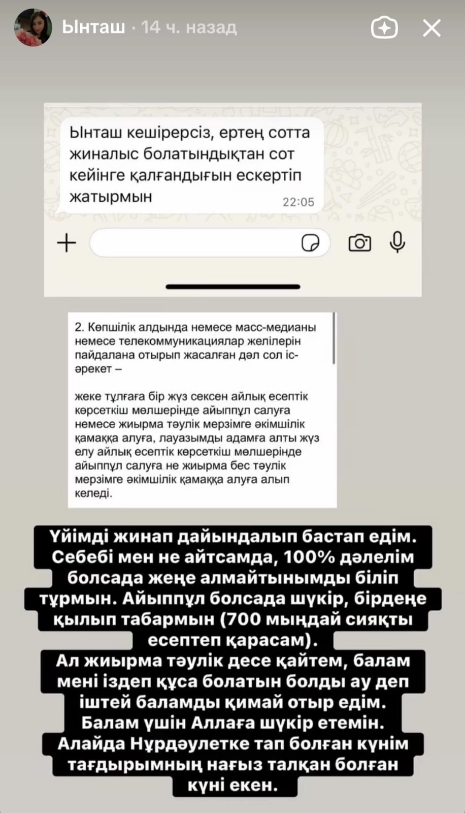 Айыппұл болса да шүкір, бірдеңе қылып табармын. Ал жиырма тәулікке қамаса қайтемін? Балам мені іздеп құса болатын болды деп іштен қимай отыр едім" деп жазба жариялады.