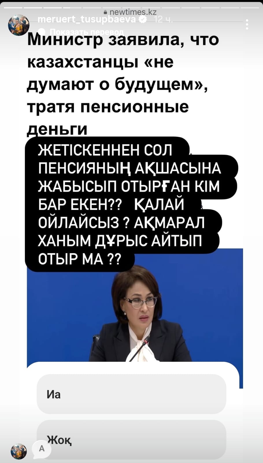 Естеріңізде болса, бірер күн бұрын Денсаулық сақтау министрі Ақмарал Әлназарова "қазақстандықтар болашағын ойламай, зейнетақыдағы ақшаларын жаратып жатыр"деген еді.
