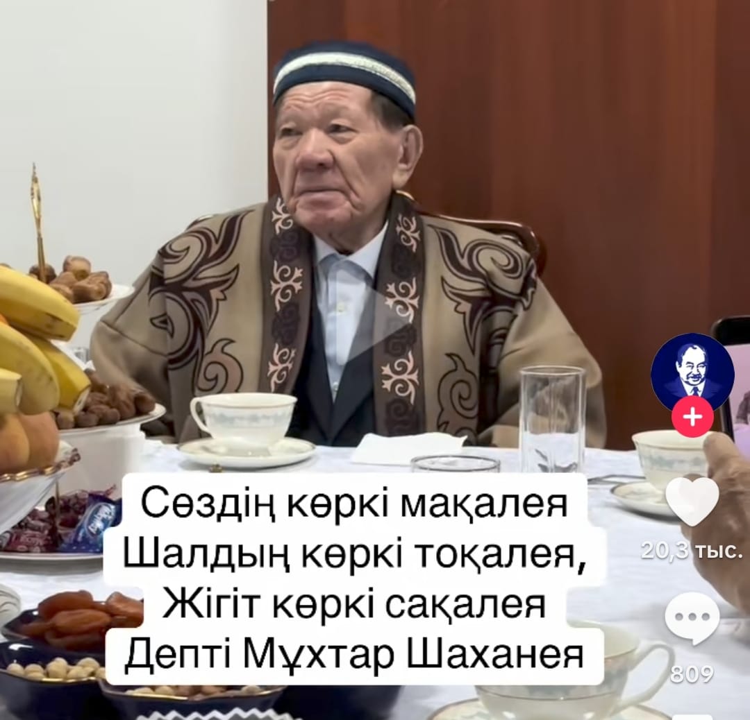 Видеода ақын ағамыз: "Сөздің көркі - мақалия, шалдың көркі - тоқалия, жігіт көркі - сақалия, депті Мұхтар Шахания" дейді. Ақынның осы бір шумақ өлеңді видеосына қатысты жұрт "мына кісіге не болған", "ұят емес пе, осы жасында" десе, келесі тарап "әзілдеп отыр ғой", "атамыз 100 жасасын", "бұл кісідей қазаққа еңбегі сіңген адам аз" деген сыңайда пікір жазуда. Фото видеодан скринделді. https://www.tiktok.com/@mambetov__theatre/video/7495456018424433975?_r=1&_t=ZM-8vnpn5B3RG2