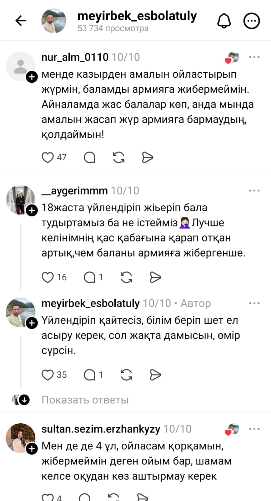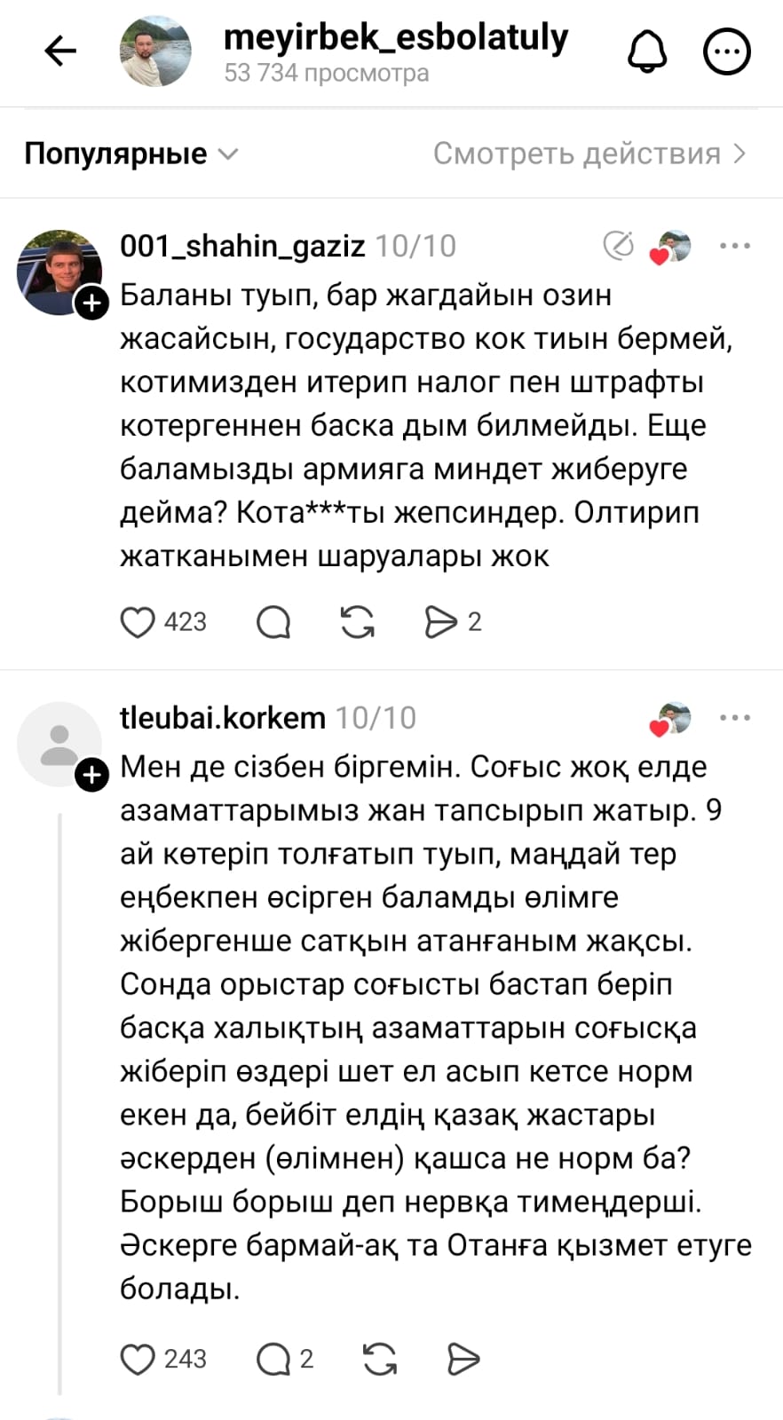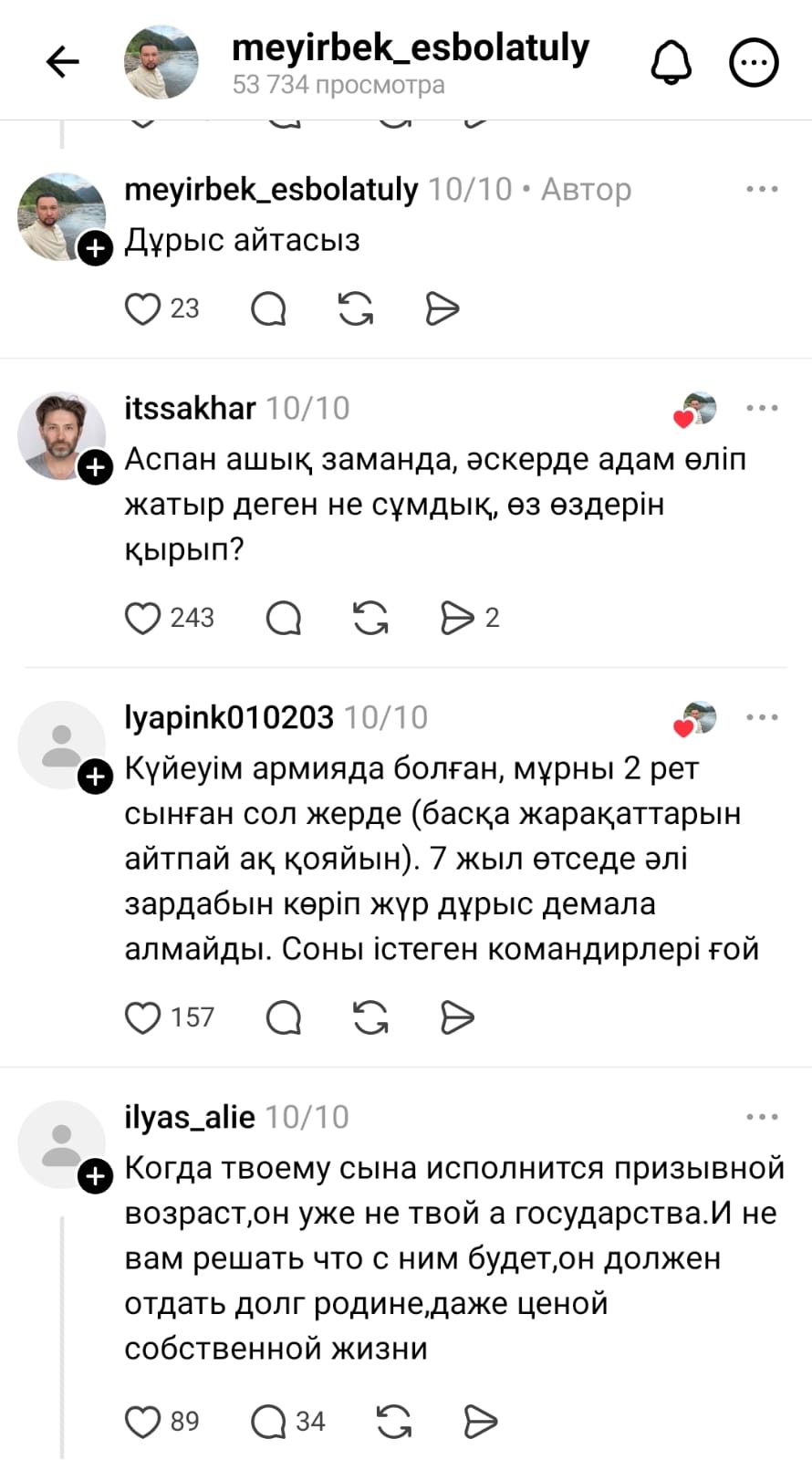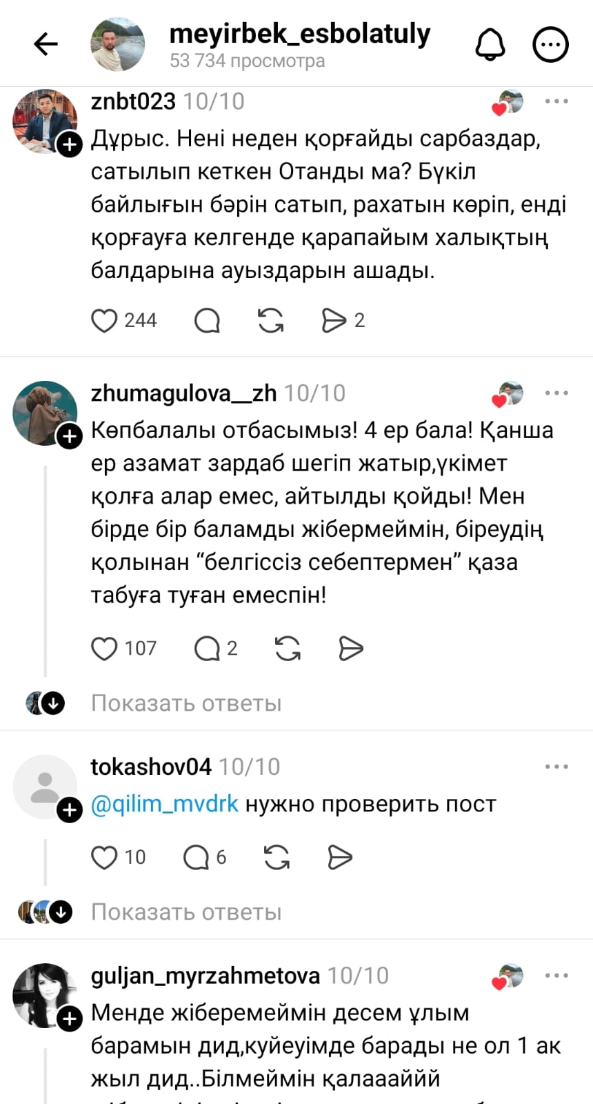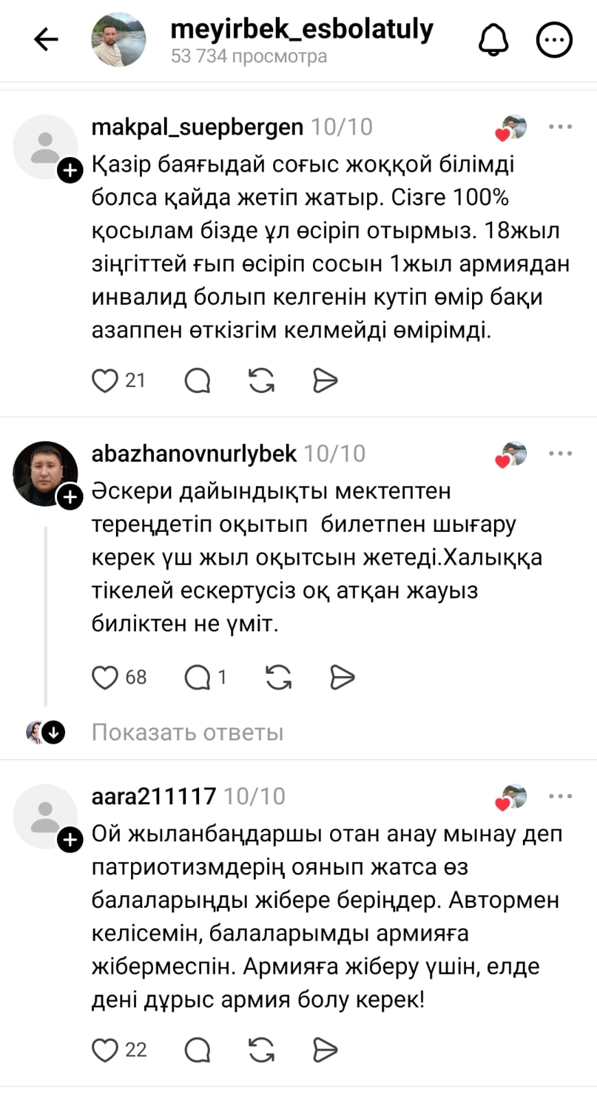 "Қазірден бастап ескерттім, қорғаныс министрлігі, үкімет, үш ер бала өсіріп отырмын, біреуінде әскерге жібермеймін, с.. де қол қойдым мынандай отанды. Тізімнен сызып тастай беріңдер"деп жазды Мейірбек Есболатұлы.