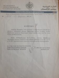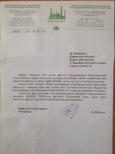 «Ақыт қажы» мешітінің ғимараты мен жертелімін ҚМДБ меншігіне тапсыр» деп Жанарбек Мамбарға хат жолдаған (хат суретте).