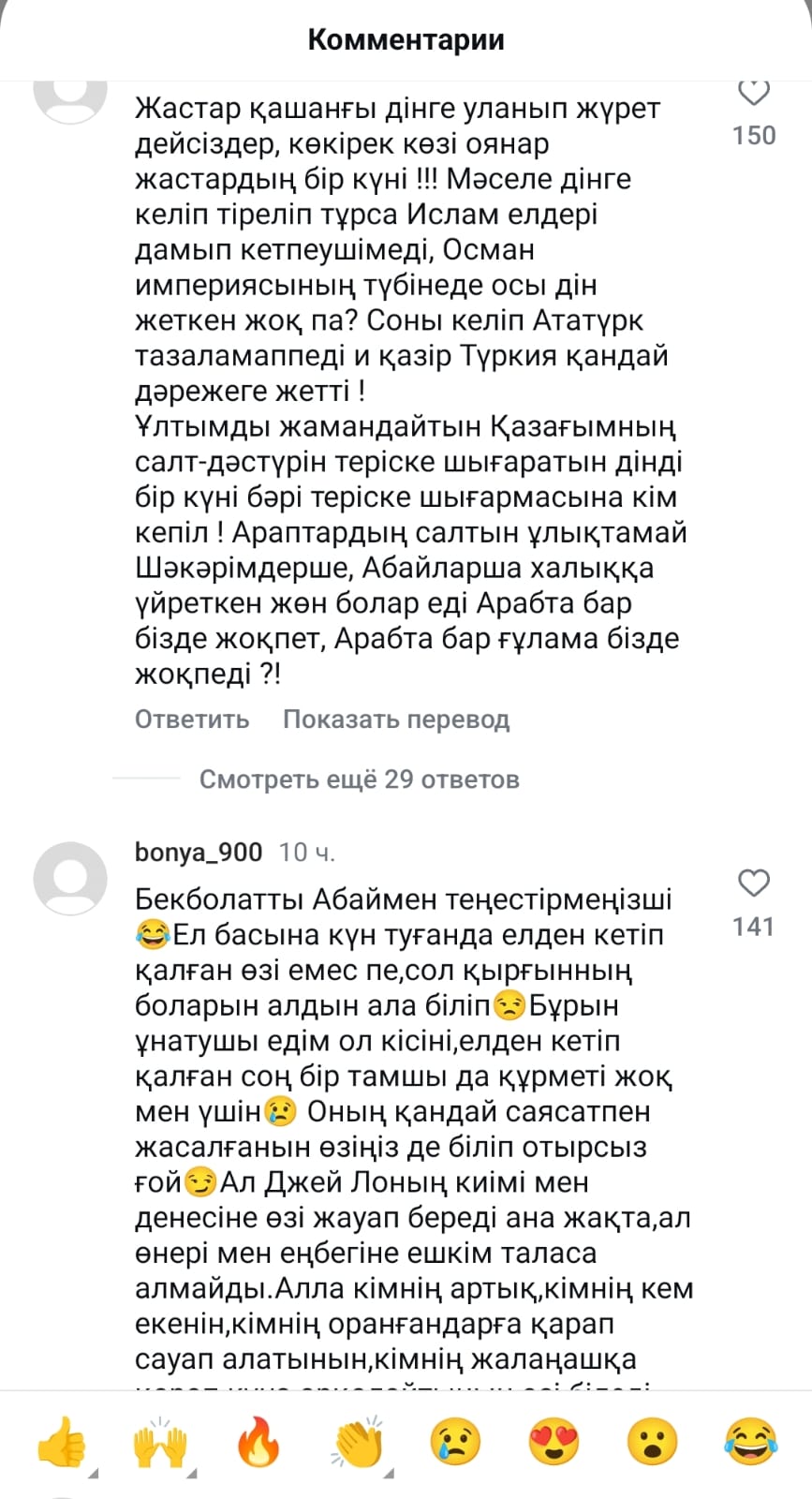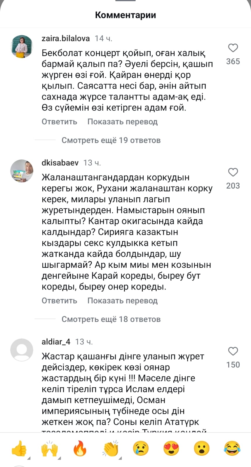 Бес ғасырыңды жырлап берген Бекеңе "арабқұл" деп ат қойып, айдар таққандар жалаңаш қатынның концертіне барған 25 мың адамды кімнің құлы дейді екен?" Деп жазды Арман Бердалин.