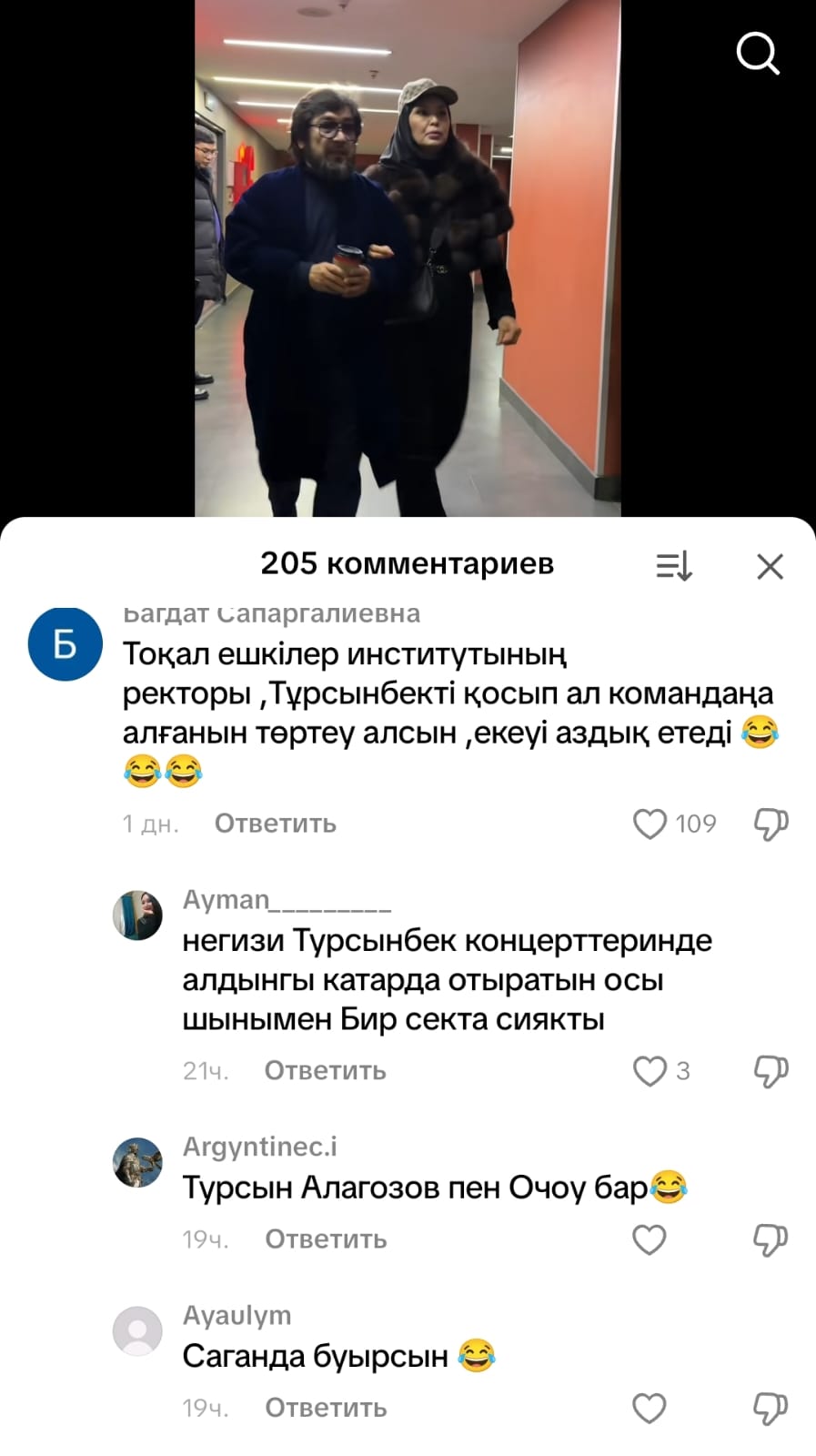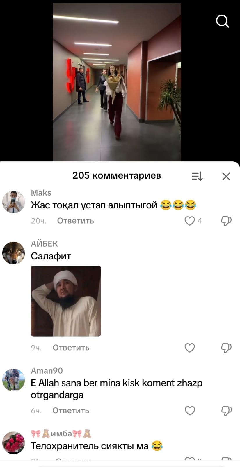 ТикТок желісінде тараған видеода діндар Бекболат Тілеуханның жанына ерткен әйелдерінің бірі бар. Өзінен бойы ұзын келіншегін жетектеген діндар "Алло" киносына кіріп бара жатты.