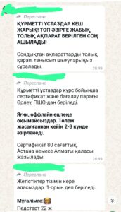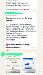Тараған жазбадан түсінгеніміз, мұғалімдердің аттестациясына жарамды, базаға тіркелетін, 514 бұйрықта көрсетілген біліктілік сертификаттары ашықтан-ашық сатылуда. Төмендегі суреттерден қандай сертификат, қай дәрежеде саудаланып жатқанын білу қиын емес.