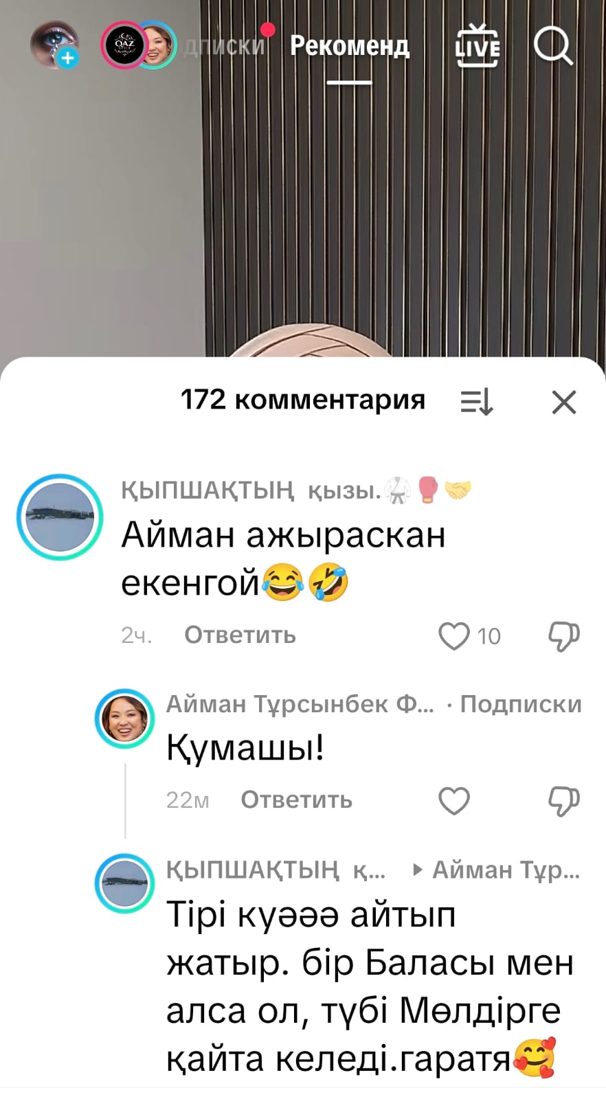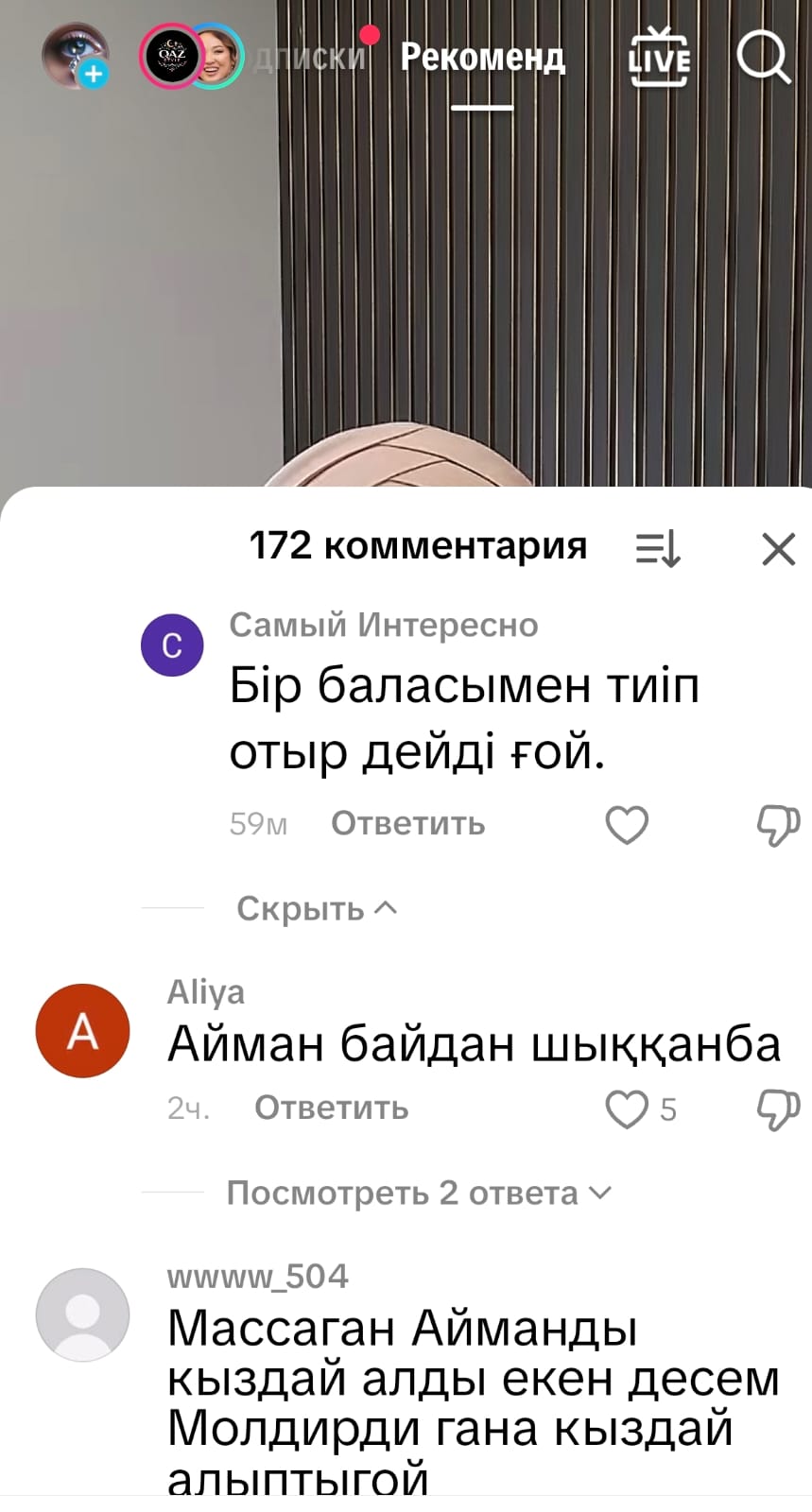 Әзірге бұл келіншектің видеосы мен айтқандарына қатысты Тұрсынбек Қабатовтан да, Айманнан да ресми берілген жауап болмады.