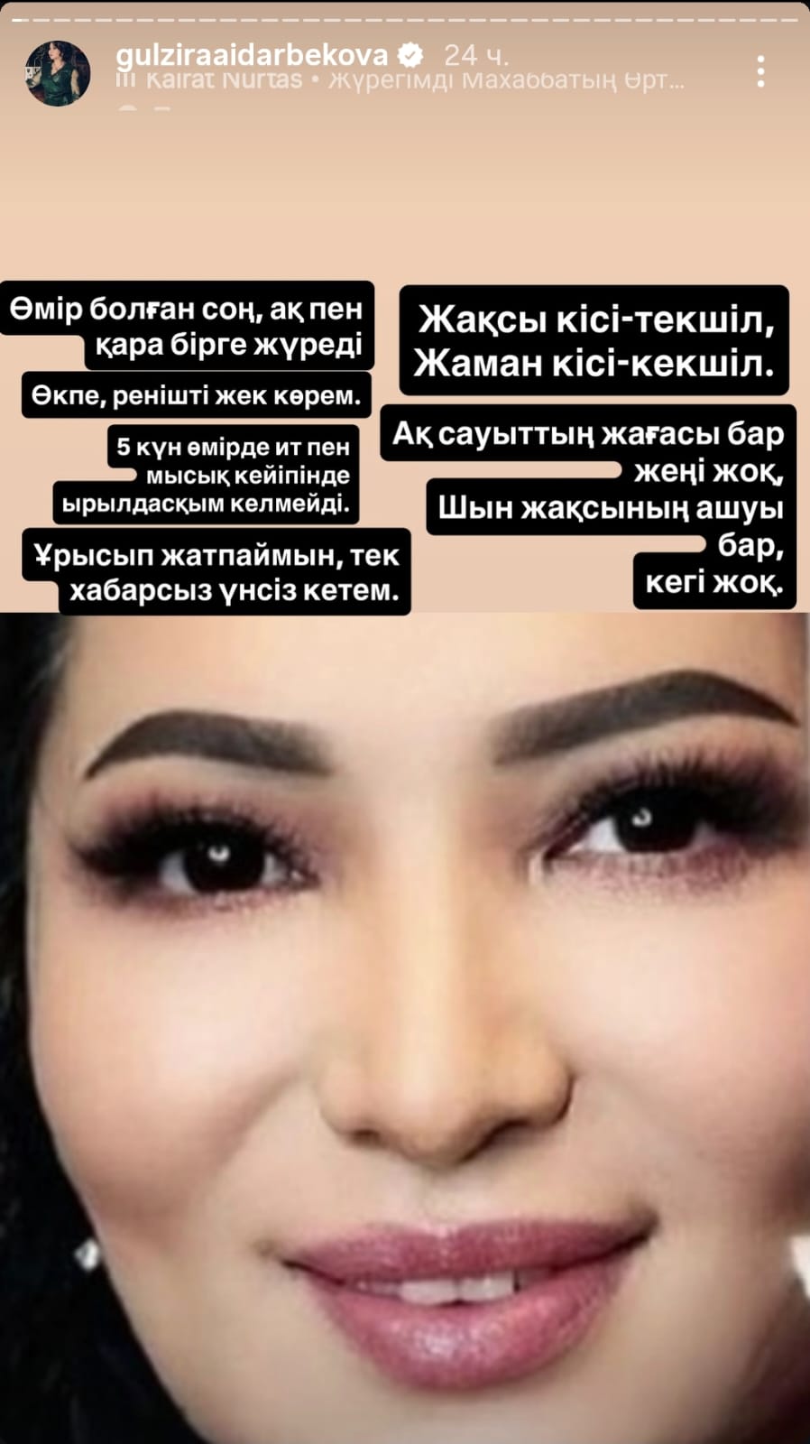Гүлзира Айдарбекова өзінің әлеуметтік желідегі парақшасында бөліскен бұл жазбалар нақты кімге арналған белгісіз.