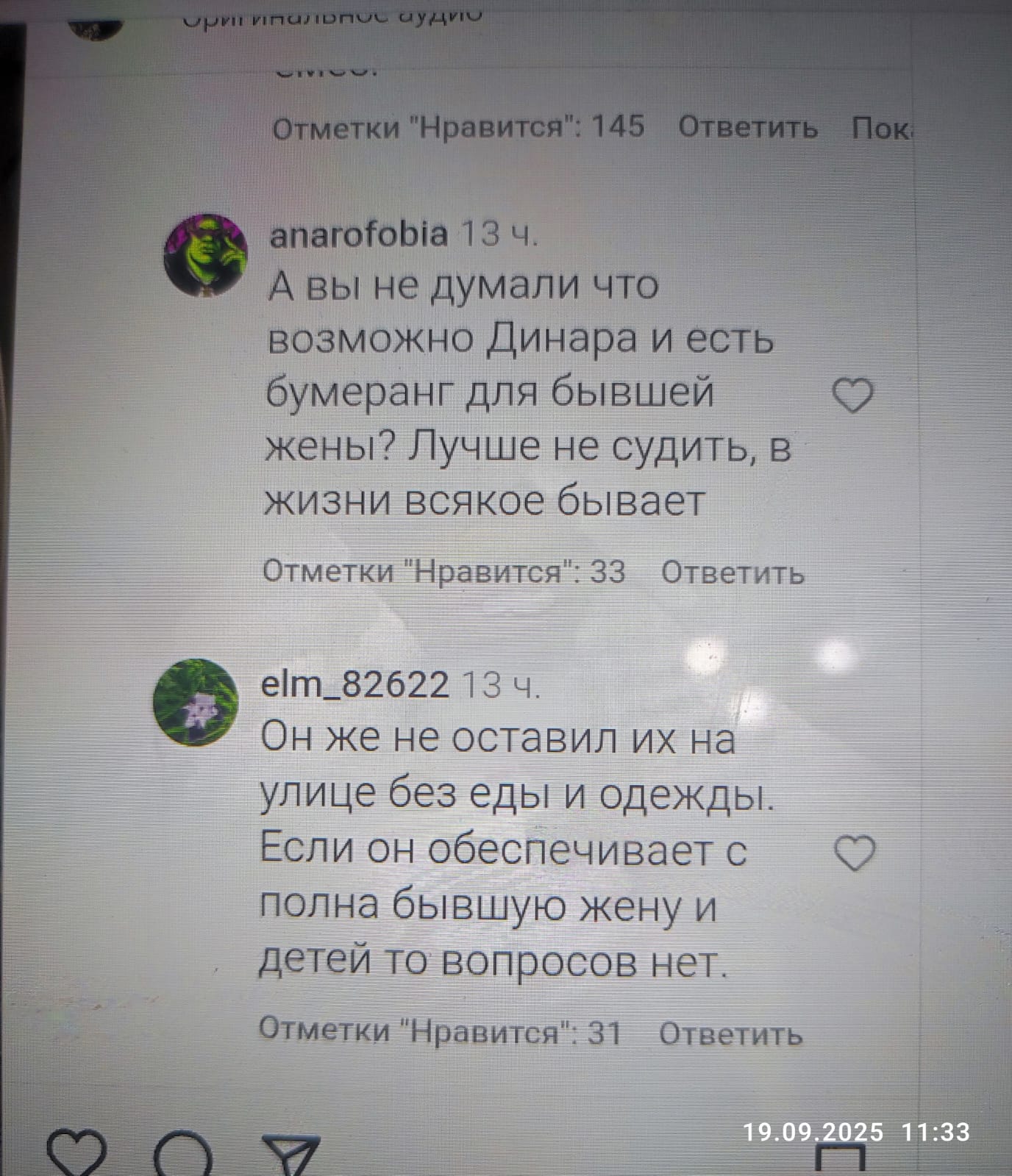 Әдеттегідей "Динара бес баласы бар отбасыны бұзды. Бумеранг деген бар. Жазасын алады" дегенге саятын пікірге жазылған жауап көптің көкейінен шыққандай.