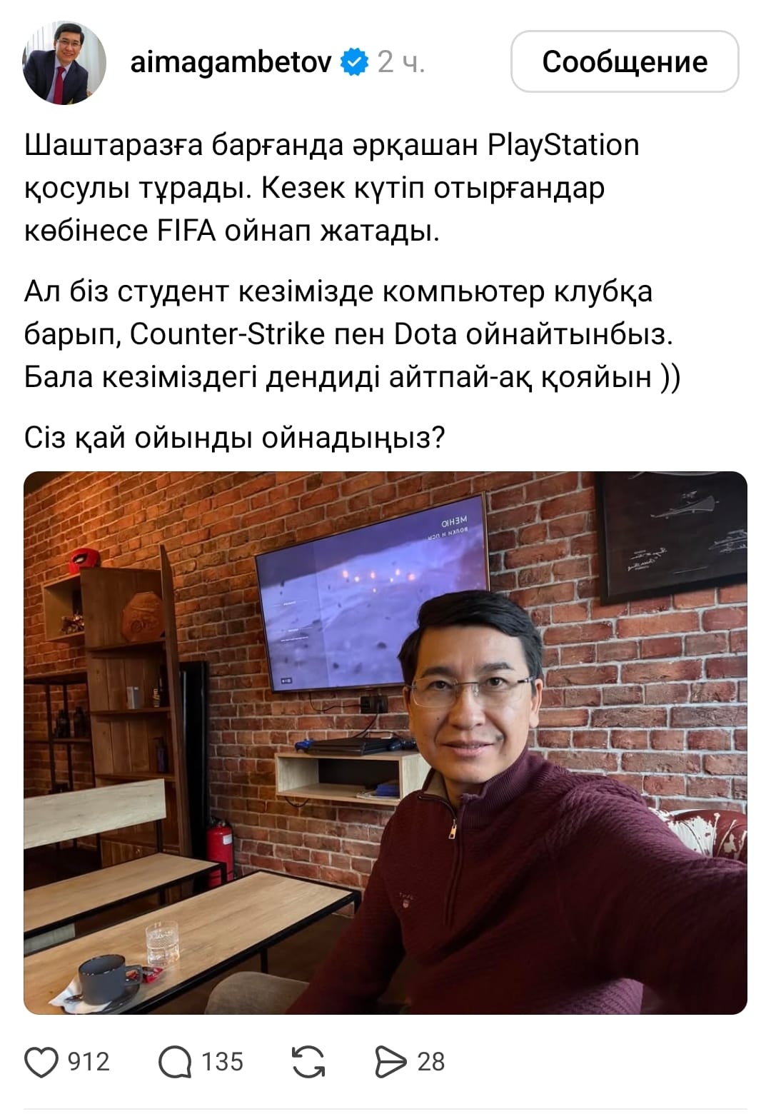 "Шаштаразға барғанда әрқашан PlayStation қосулы тұрады. Кезек күтіп отырғандар көбінесе FIFA ойнап жатады.Ал біз студент кезімізде компьютер клубқа барып, Counter-Strike пен Dota ойнайтынбыз. Бала кезіміздегі дендиді айтпай-ақ қояйын ))Сіз қай ойынды ойнадыңыз? " деп сауал тастады Асхат Аймағамбетов.