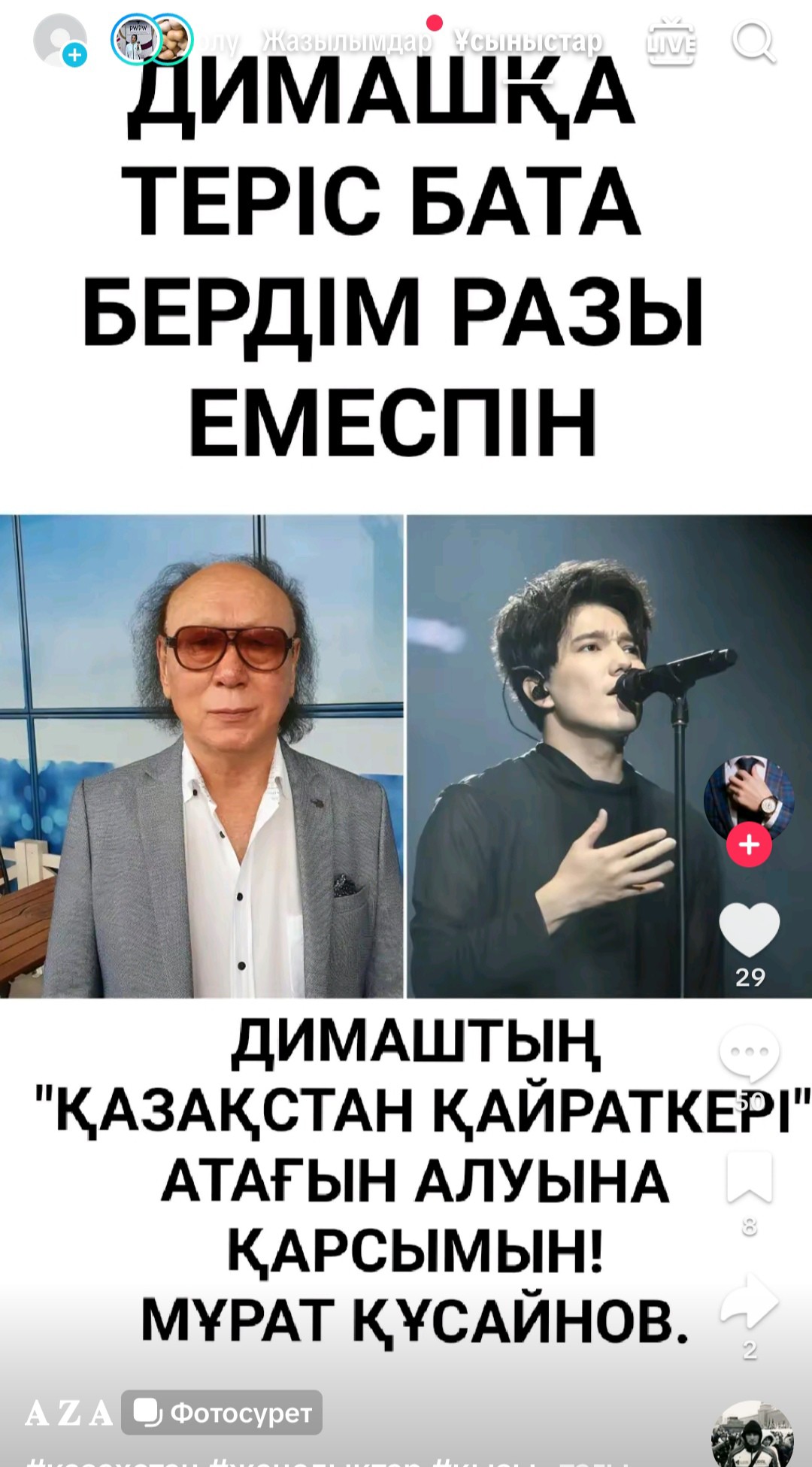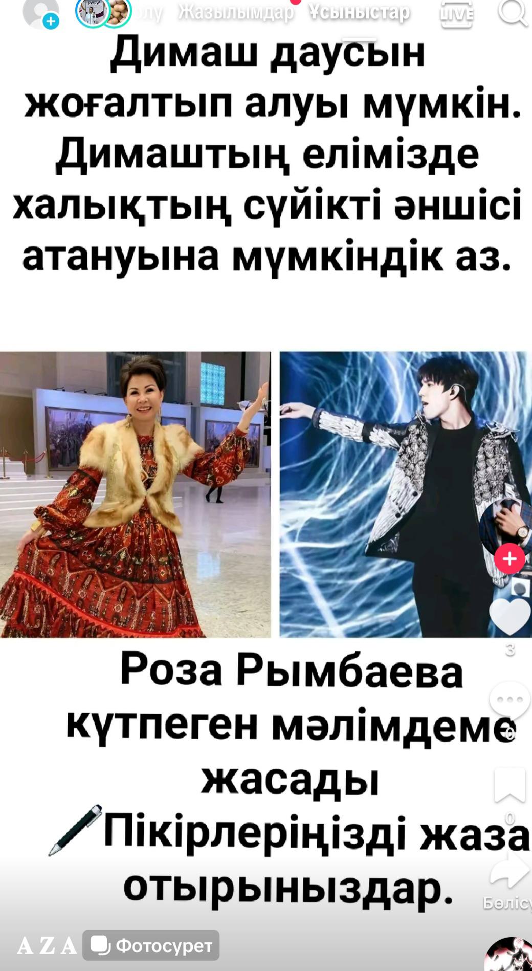 Мұрат Құсайынов Димаш туралы жаман айтпаған. Роза Рымбаеваның Димаш туралы бір ауыз жаман сөзі жоқ. Досым Сүлеев те, Айгүл Иманбаева да, Мейрамбек Беспаев та , Қайрат Нұртас та-Димашты мақтаған"деп жазды.
