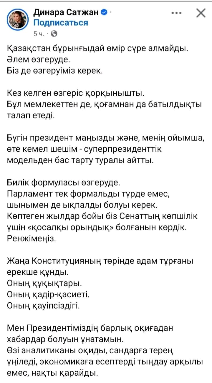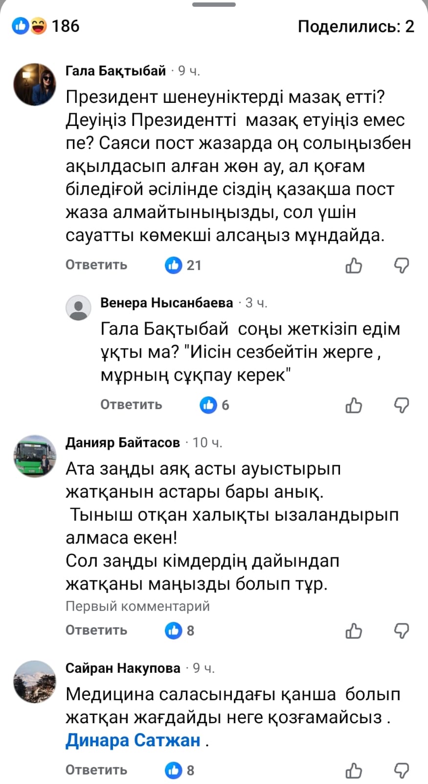 Танымал блогер Динара Сәтжан кешегі өткен Үкіметтің кеңейтілген жиынына және Президент Тоқаевтың айтқандарына қатысты пікір білдірем деп, жұрттың қызу талқысына түсті деп жазады Democrat.kz.