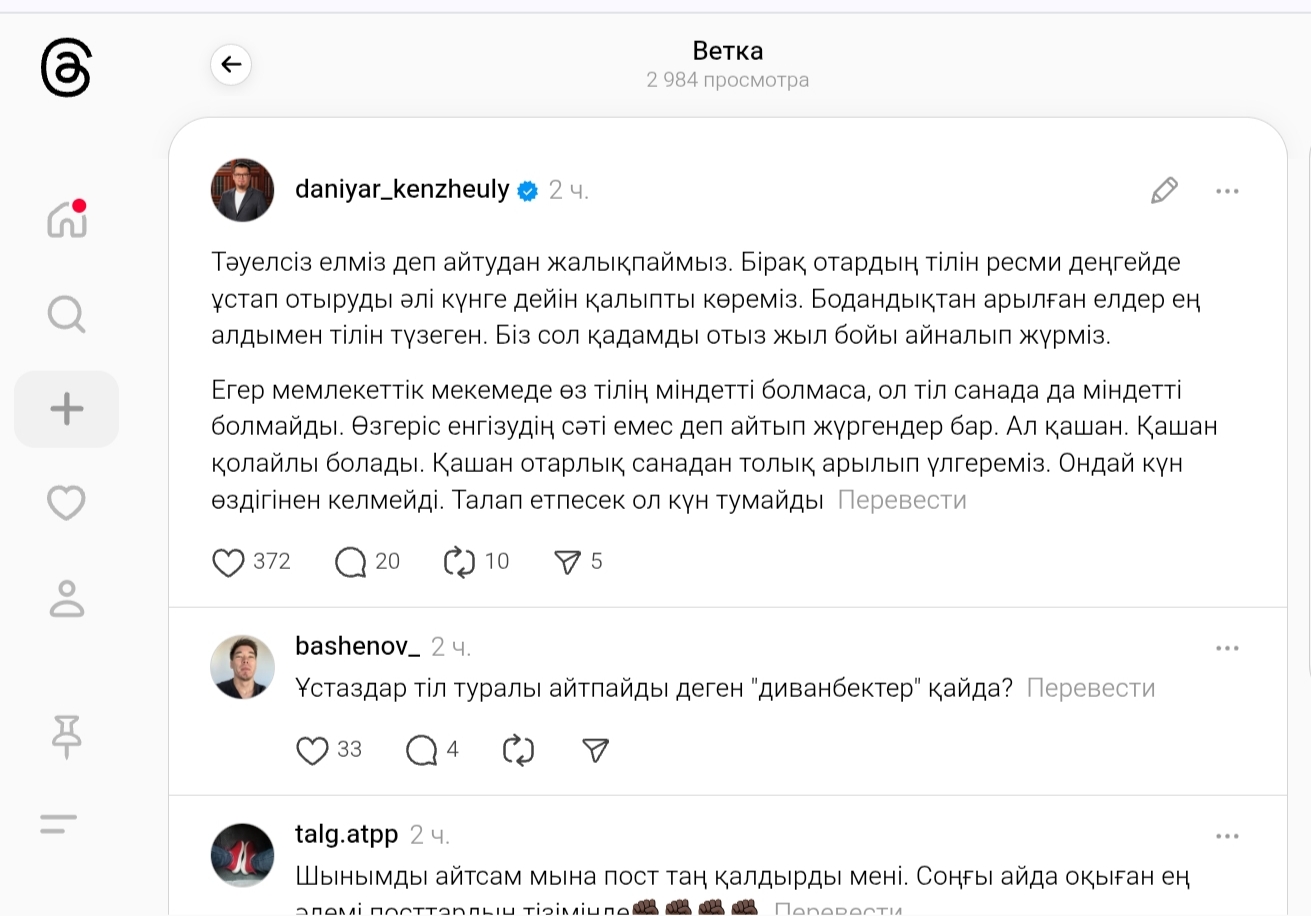 Діндар Данияр Кенжеұлы өзінің әлеуметтік желі парақшасында тіл мәселесіне қатысты жазба жариялады деп жазады Democrat.kz.