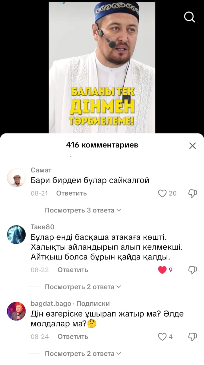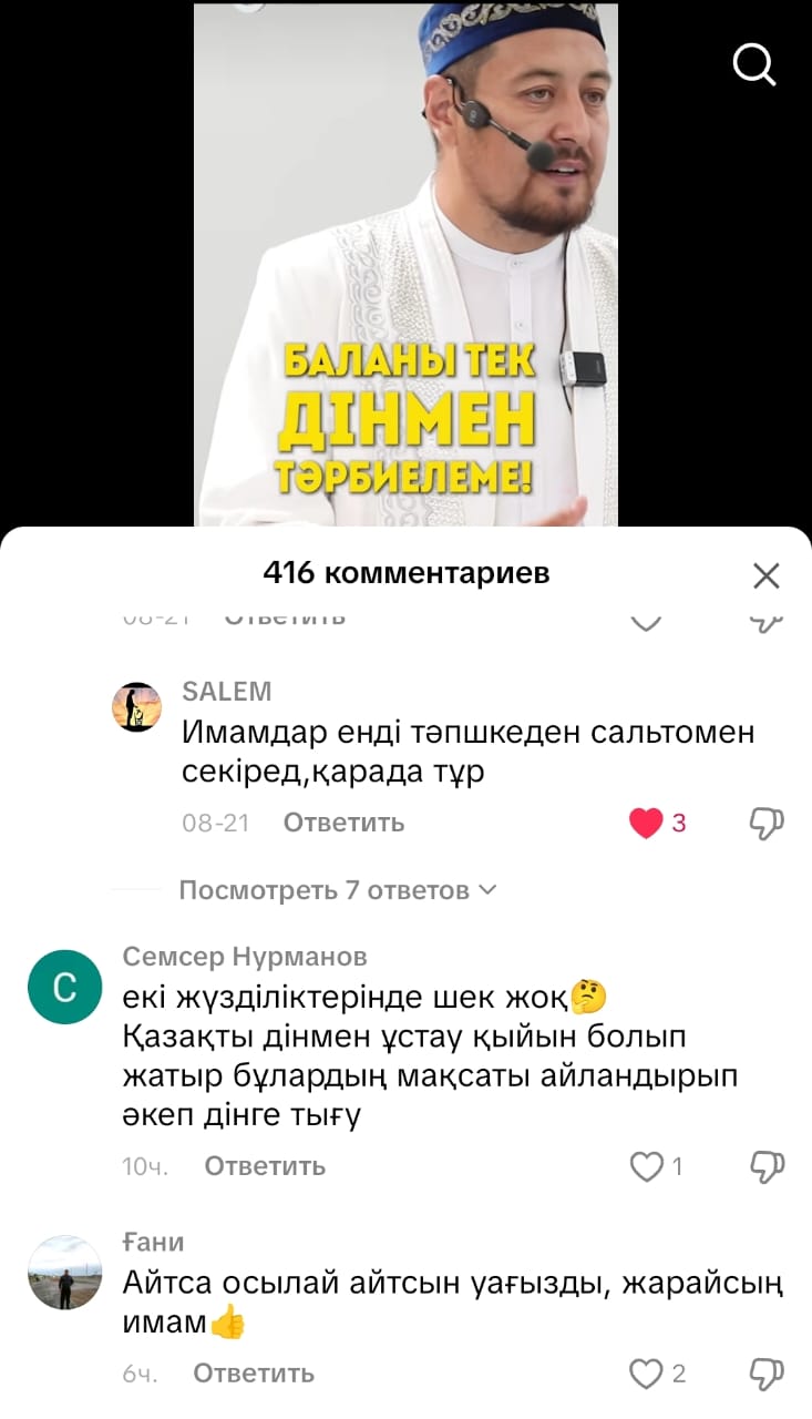"Балаңа діни тәрбие бер. Бірақ одан маңыздысы және бастысы, балаңның бойына ұлттық құндылықтарды сіңір"дегенге саятын уағызымен жұрттың көңілін жібіткен имамның сөздеріне "міне, уағызды осылай айту керек", "өте дұрыс" деушілер аз емес.