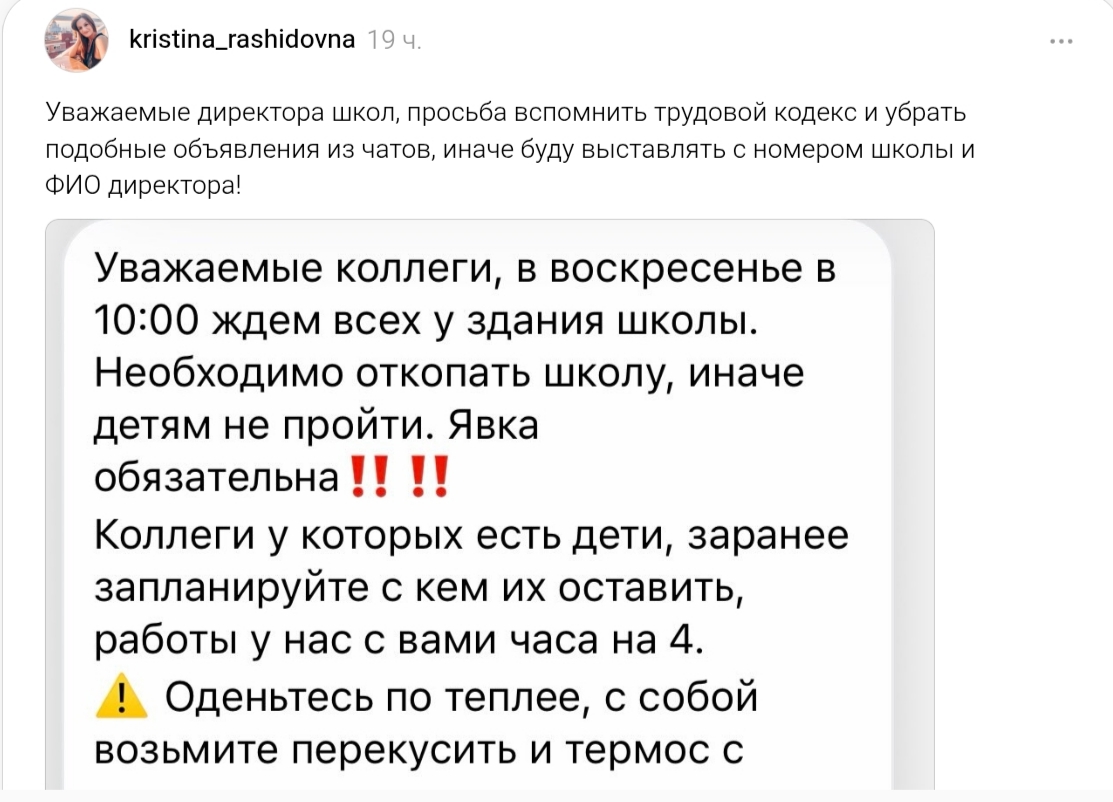 Әлеуметтік желіде тараған хабарламада мектеп директоры демалыс күні мұғалімдерді мектеп айналасын қардан тазартып, шұңқыр қазуға шақырған.