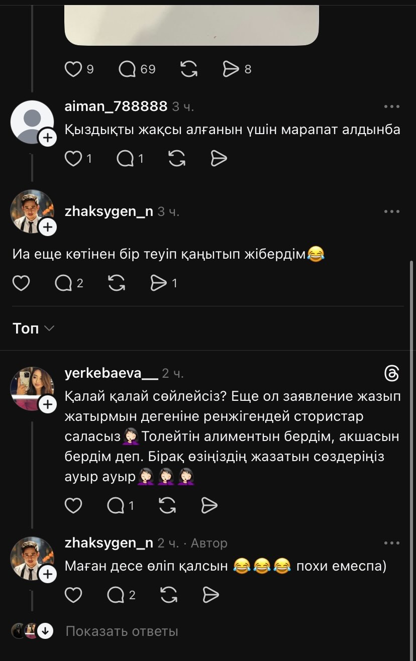 Елбасыдан алған марапатына лайық болғанын көрсетудің орнына, керісінше, оқырмандарына ұятсыз сөз жазып, ол аз десеңіз,бұрынғы әйелі туралы, "оның әке шешесінің үйі жоқ, қаңғып жүр" деп жағымсыз дүниелер жазуда.