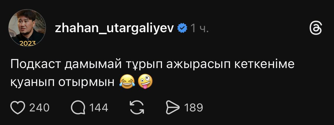 Threads әлеуметтік желісінде актер Жахан Отарғалиевтің "подкаст дамымай тұрып ажырасып кеткеніме қуанып отырмын" деген жазбасы қызу талқыға түсті.