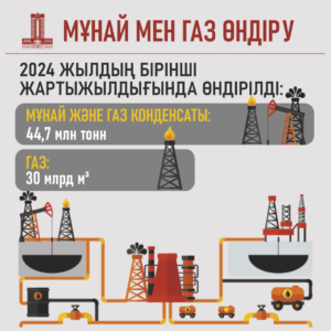 2024 жылдың басынан бастап Қазақстан мұнай мен газ өндірудің айтарлықтай көлемін көрсетіп келеді. Барлығы 44,7 млн тонна мұнай мен газ конденсаты өндірілді, оның негізгі бөлігі «Теңізшевройл», «Қарашығанақ Петролеум Опер. Б.В.» және «Норт Каспиан Оперейтинг Компани Б.В.» компанияларына тиесілі.
