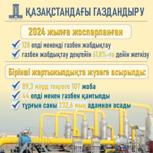 2023 жылдың қорытындысы бойынша Қазақстанда газбен қамту деңгейі 60% құрады, табиғи газға 12 млн адам қол жеткізе алды. 2024 жылға 128 елді мекенді газдандыру жоспарланған, бұл газбен жабдықтау деңгейін 61,8%-ға дейін арттырады.
