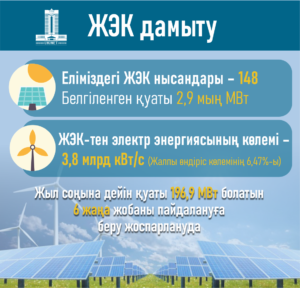 Елімізде белгіленген қуаты 2,9 мың МВт болатын 148 ЖЭК нысаны жұмыс істейді. Осы жылдың соңына дейін қуаты 196,9 МВт болатын 6 жаңа ЖЭК жобасын пайдалануға беру жоспарлануда.