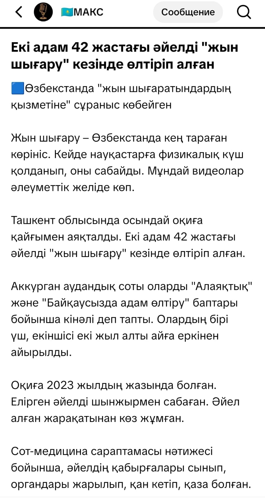 Ақпаратта өзбекстандық имамның "жын шығарам" деп әйелді өлтіріп алғаны туралы айтылады.