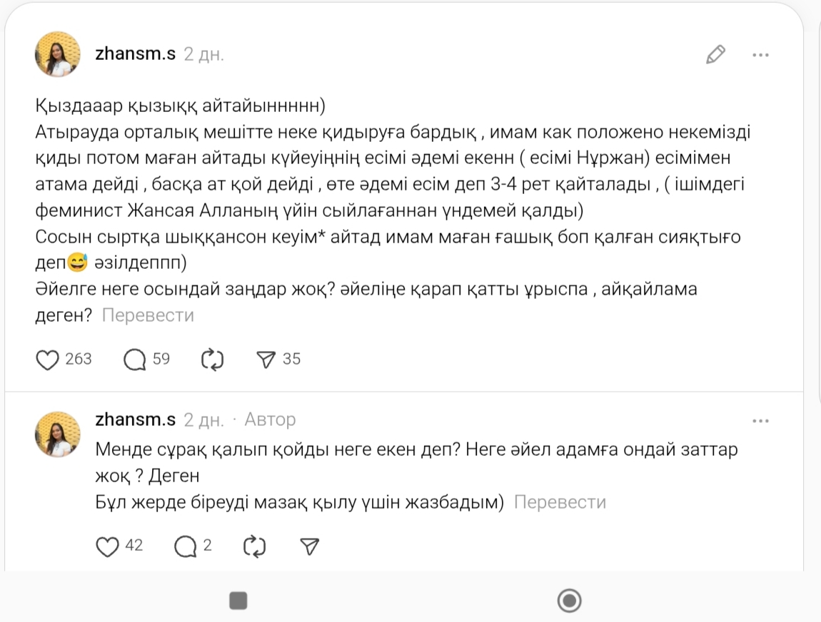 Атыраулық Жансая есімді әлеуметтік желі қолданушы мешітте басынан өткен жайт туралы жазып, мамның әрекетіне қатысты оқырмандарына сұрау салды деп жазады Democrat.kz.