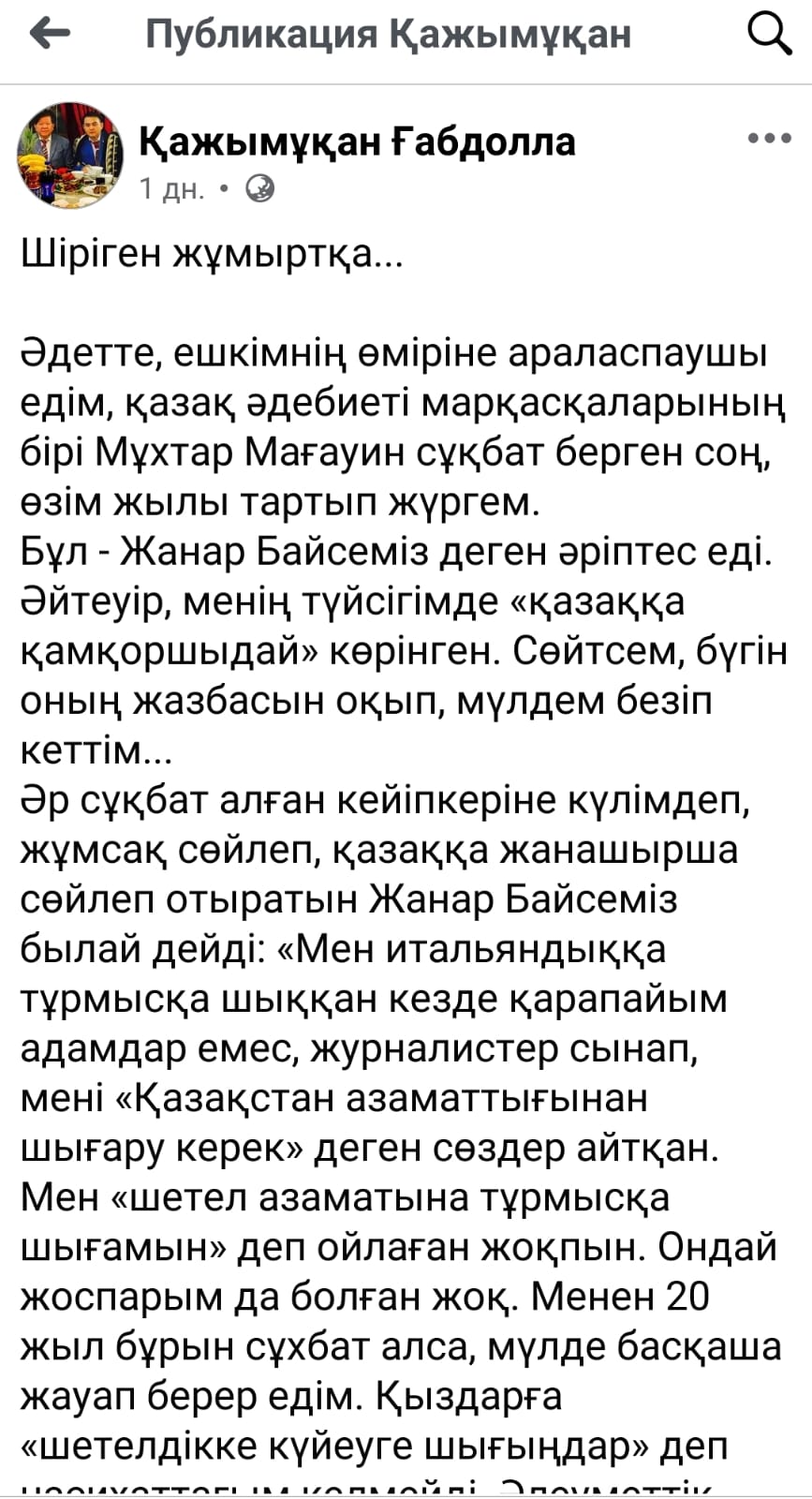 Бұл - Жанар Байсеміз деген әріптес еді. Әйтеуір, менің түйсігімде «қазаққа қамқоршыдай» көрінген. Сөйтсем, бүгін оның жазбасын оқып, мүлдем безіп кеттім...