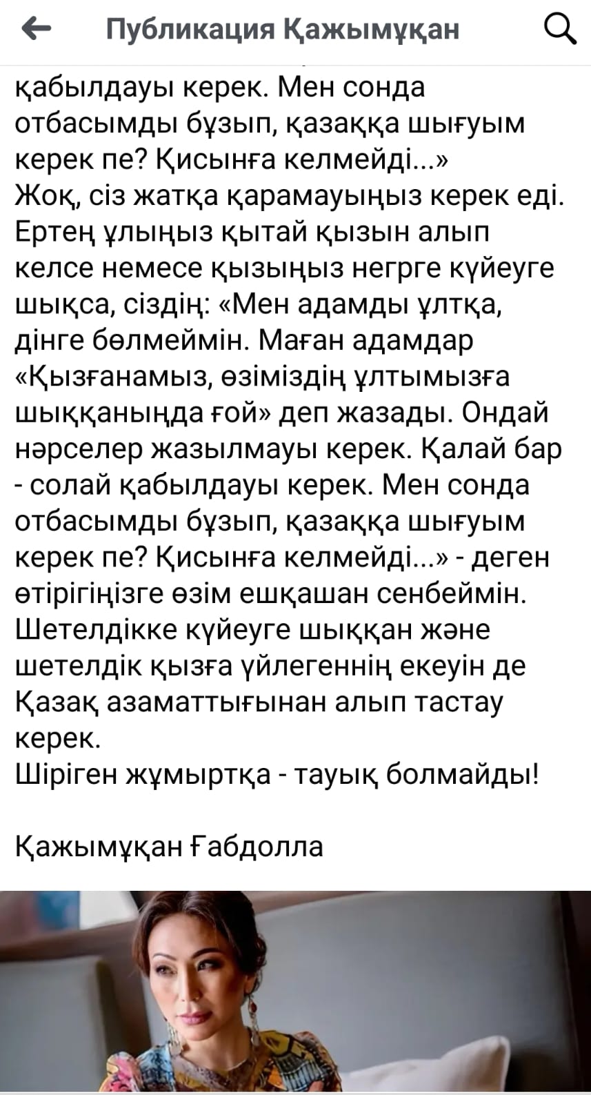 Шетелдікке күйеуге шыққан және шетелдік қызға үйлегеннің екеуін де Қазақ азаматтығынан алып тастау керек. Шіріген жұмыртқа - тауық болмайды!" Деп жазды