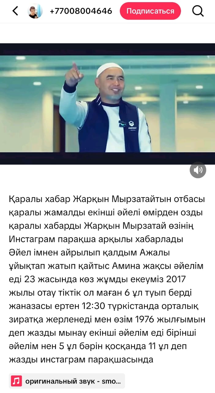 ТикТок әлеуметтік желісінде уағызшы Жарқын Мырзатайдың жас тоқалы қайтыс болғаны туралы хабар тарады деп жазады Democrat.kz.