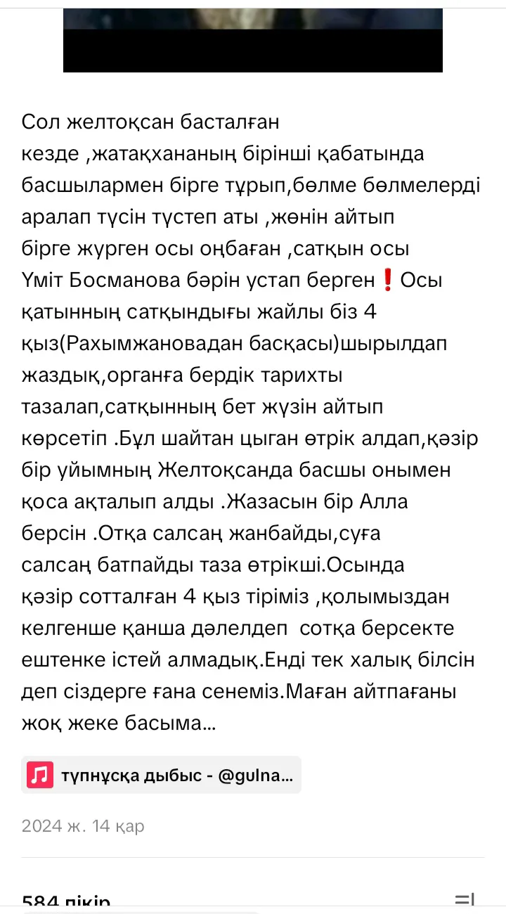 "Жатақананың бірінші қабатында басшылармен бірге тұрып бөлме бөлмелерді аралап түсін түстеп аты-жөнін айтып бірге жүрген. Бес қызды ұстап берген Үміт Босманова"деген Гүлнар Лепесбаева кейіпкердің фотосын да жариялады.