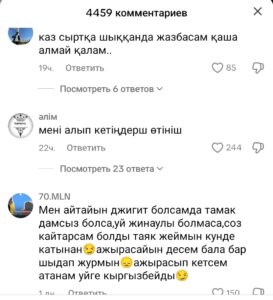 "жігіттер, пікір жазам деп, тамақтың астын күйдіріп алдым", "қазір қатыным кетсін, сосын жазам. Әйтпесе неге жылап отырсың дер", "әйелім оқып қалса, тағы қорлық көрем ғой", "қайсы бірін жазып отырасың басқа салса көнбеске амал жоқ",