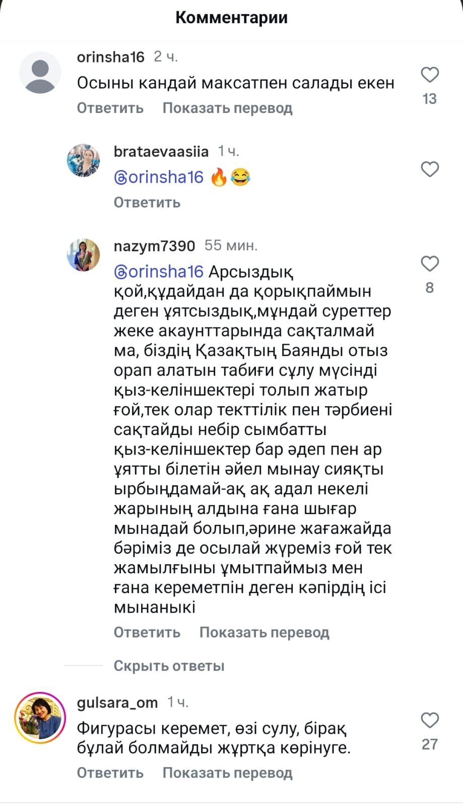 "Осы жасында мінсіз мүсінін сақтау ерлік қой!", "қандай керемет, сұлу", "өзіне өте жарасады", "не деген әдемілік" деп тамсанған оқырманмен қатар "ұятсыз", "осы жаста ұялмай ма" дегенге саятын пікір жазып, захарын төгуде.