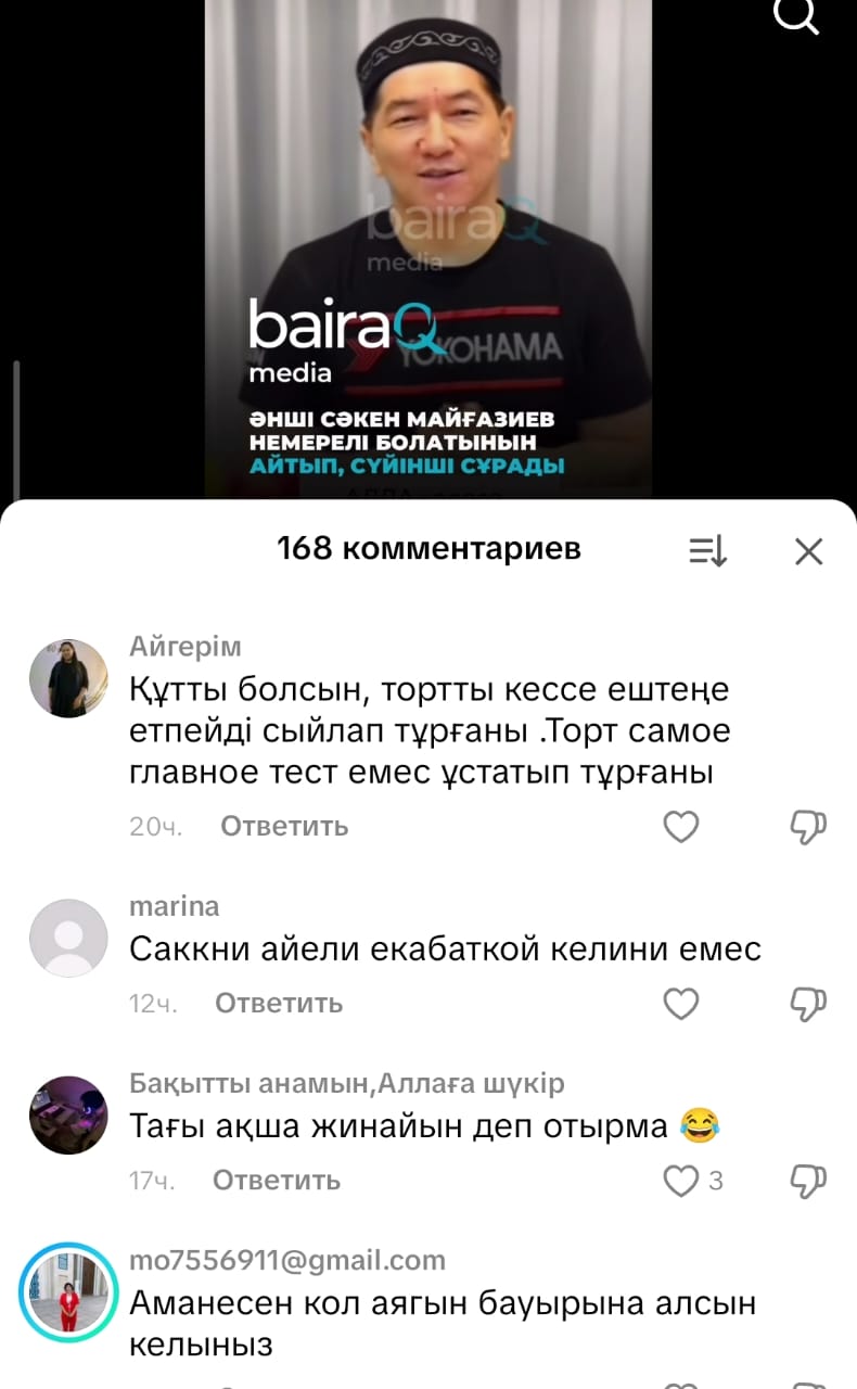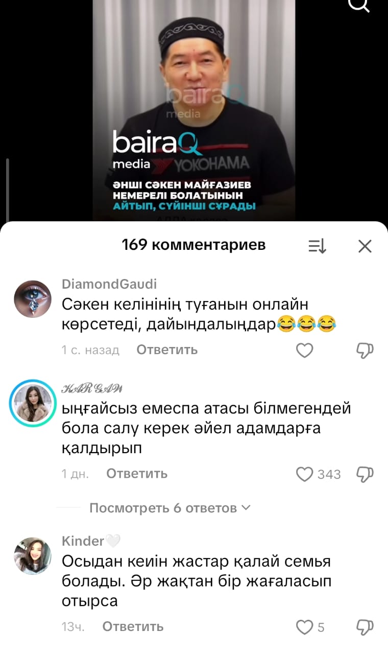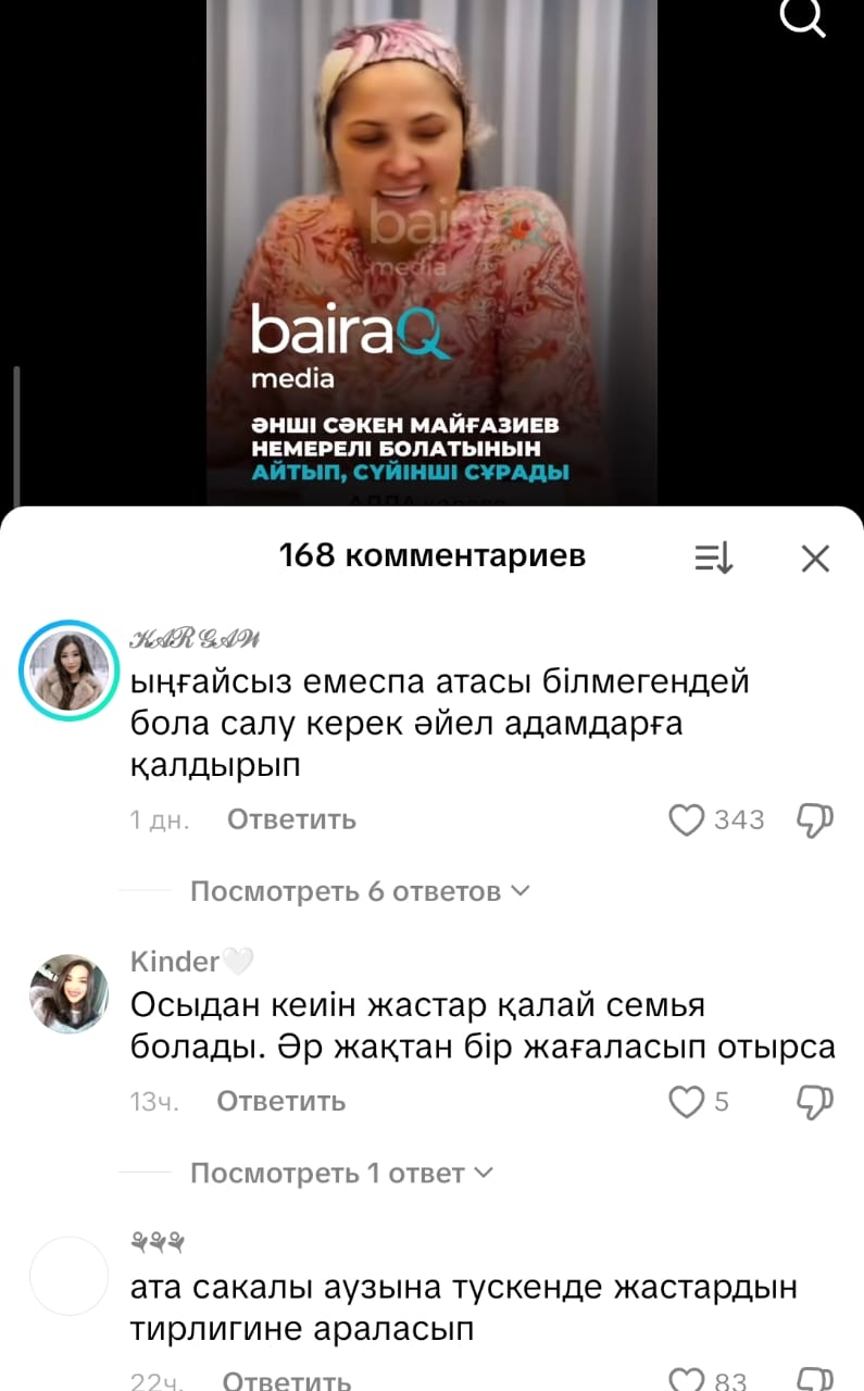 Қазақта келіннің жүктілігін ер азаматтар, әсіресе қайын атасының жар салып айтуы әбестік болатынын алға тартқан желі қолданушылар "Сәкеннің мына тірлігі ұят емес пе", "ата сақалы аузына түскенде жастардың тірлігіне араласып", "қайын атасы келіннің жүктілігінің тортын кесіп...масқара емес пе", "жастармен жағаласып жүреді екен осы", "ата деген атадай болуы керек қой, не керек көрінген затқа араласып" дегенге саятын пікір жазуда.