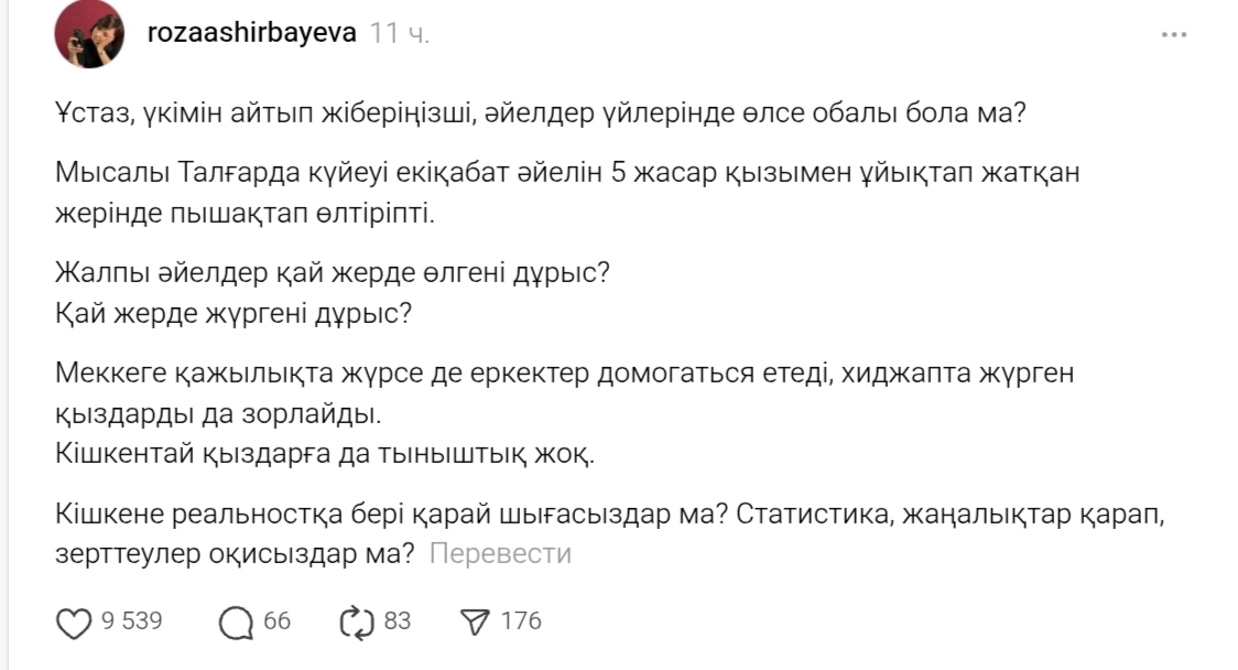 Діндар әйелдің бұл жазбасына қатысты танымал коуч Роза Әшірбай: "Ұстаз, үкімін айтып жіберіңізші, әйелдер үйлерінде өлсе обалы бола ма?