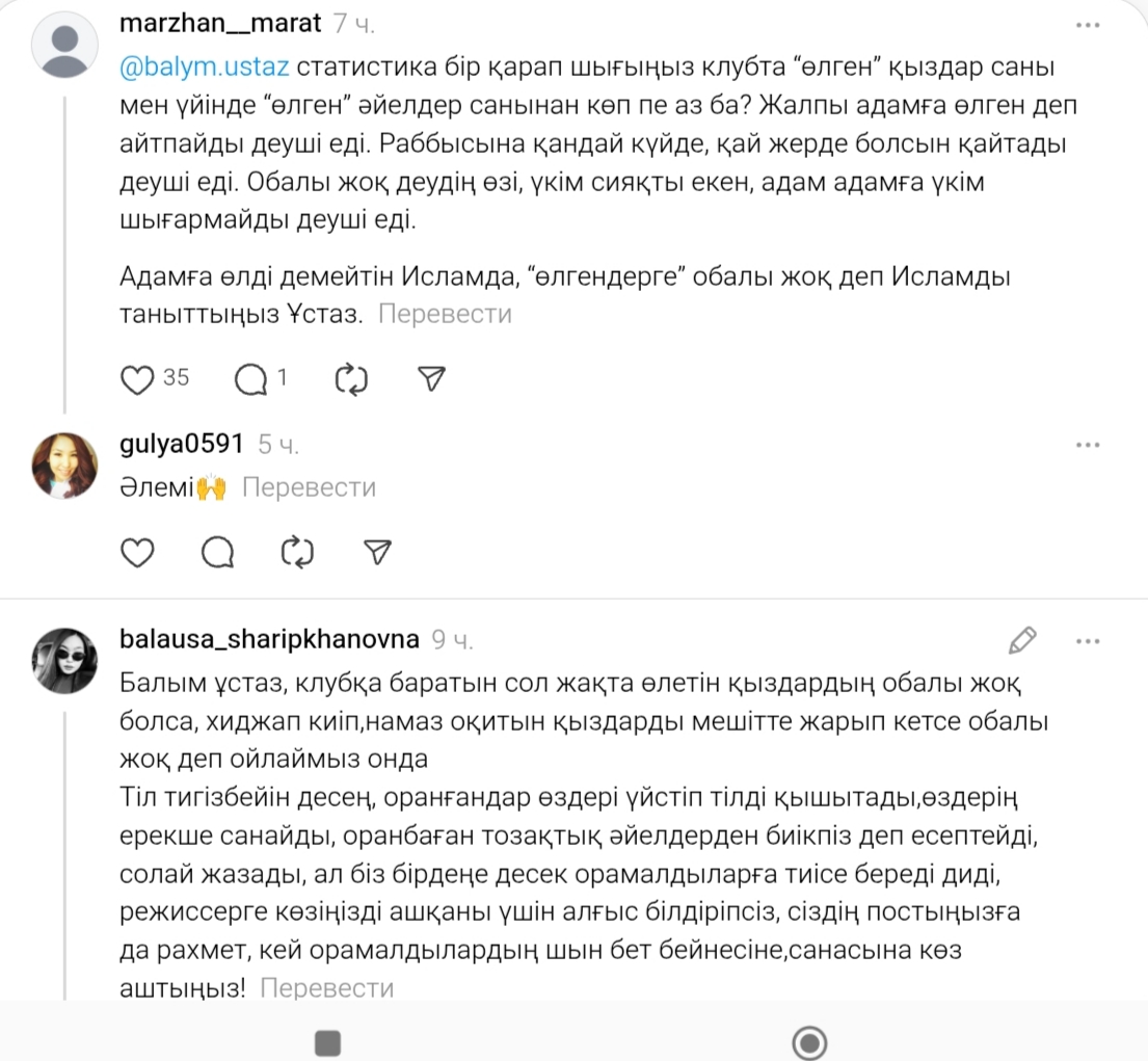 "Балым ұстаз, клубқа баратын сол жақта өлетін қыздардың обалы жоқ болса, хиджап киіп,намаз оқитын қыздарды мешітте жарып кетсе обалы жоқ деп ойлаймыз онда.
