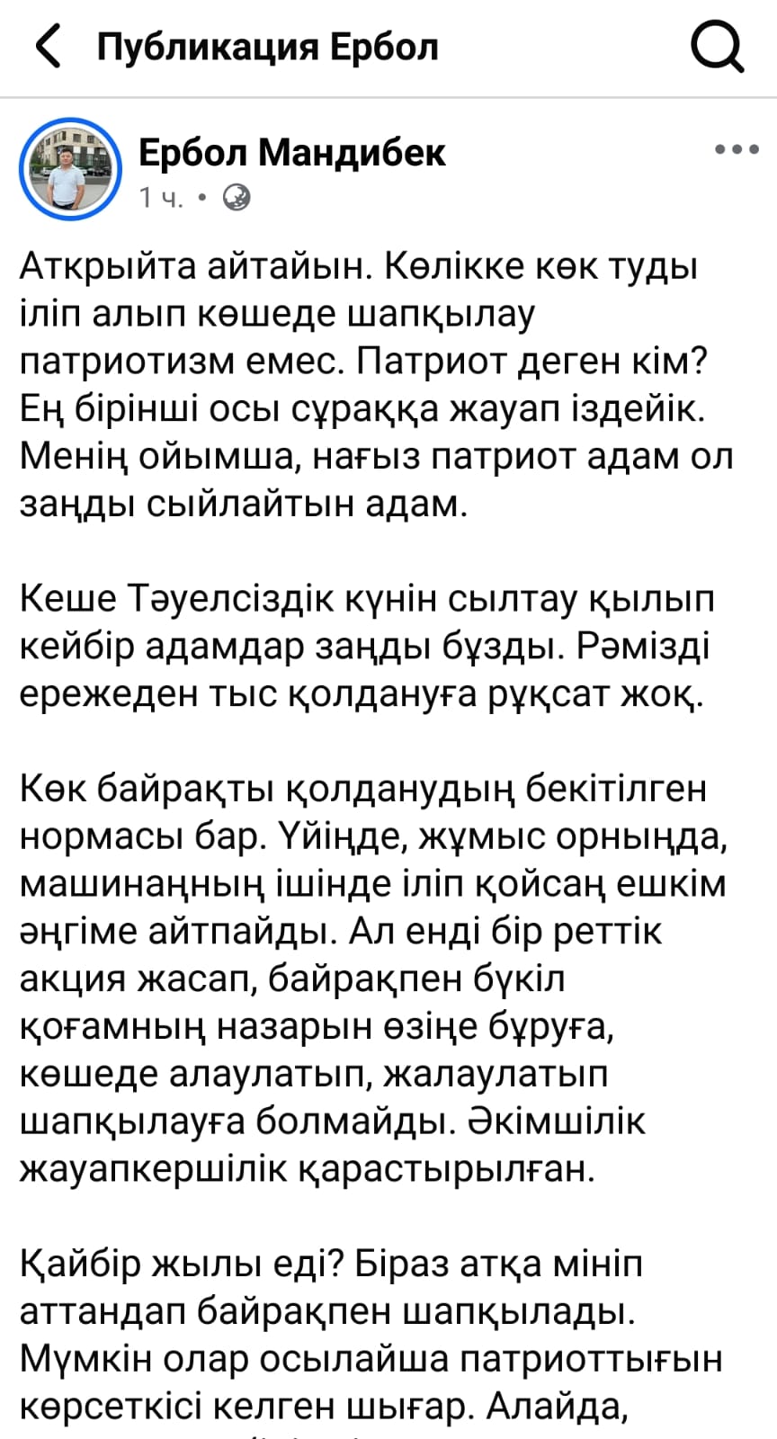 Танымал журналист Ербол Мәндібек 16 желтоқсанда көліктеріне көк туды іліп, отансүйгіштігін паш еткендерге қатысты "бұл патриотизм емес" дегенге саятын жазба жариялап, сынға қалды деп жазады Democrat.kz.