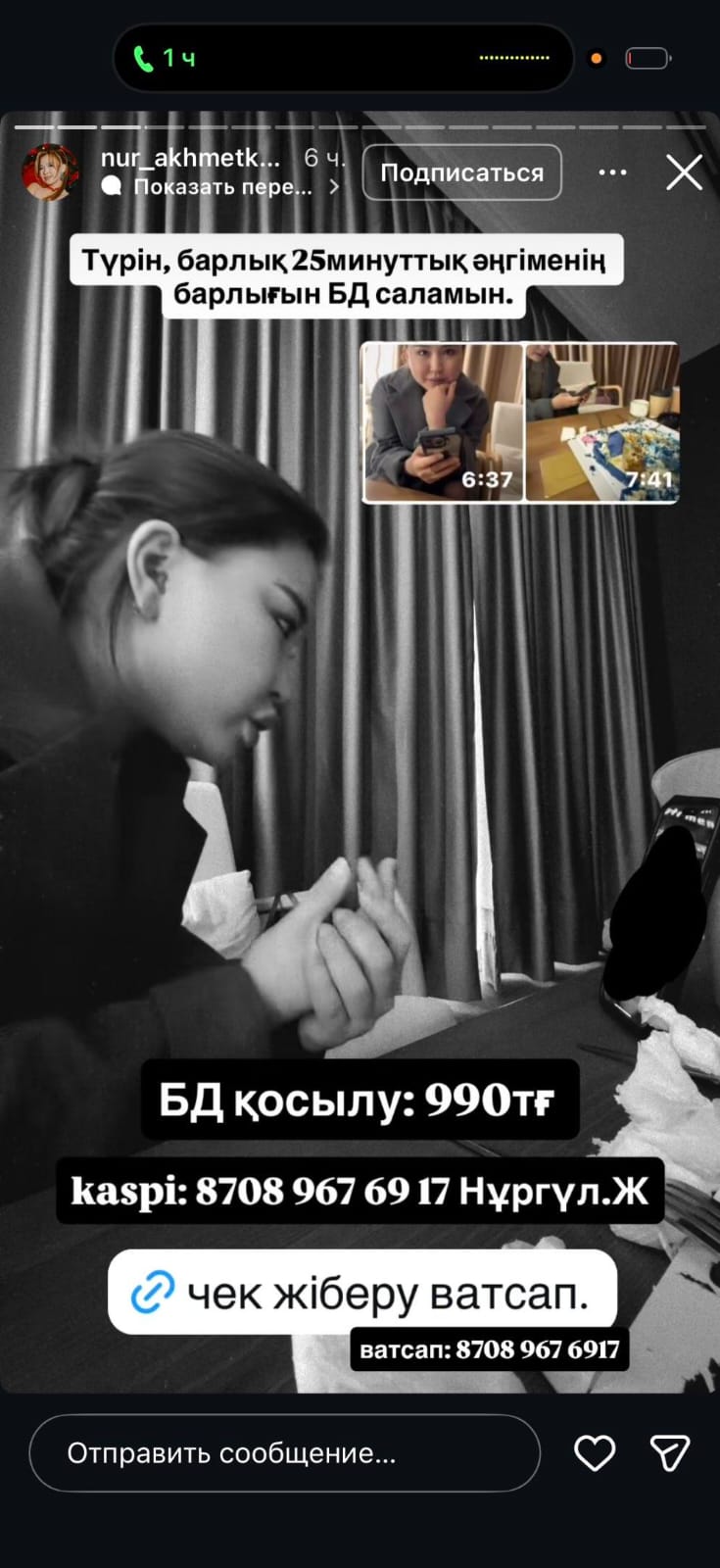Осы видеоның артынан блогер қыз "Түрін, осы әңгіменің барлығын БД саламын. БД қосылу: 990 тг."деген хабарлама фотосын салған.