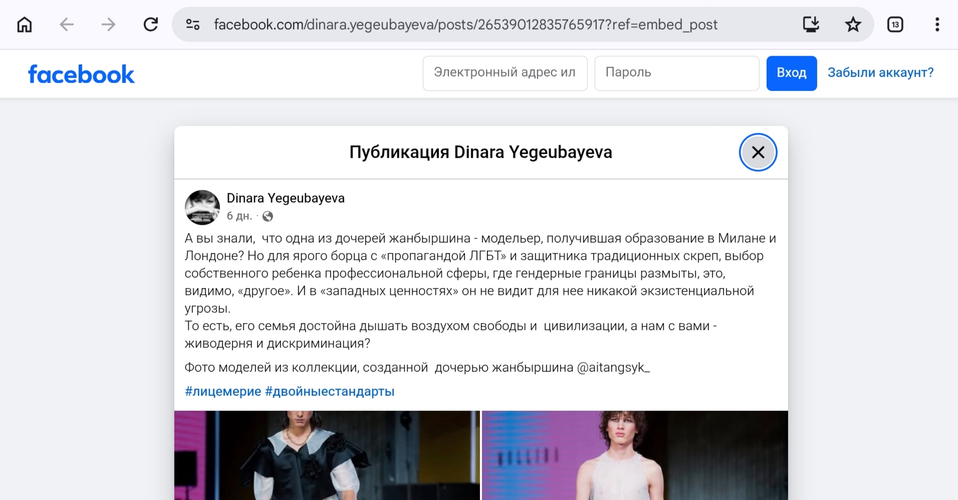 Журналистің жазуынша, депуттаттың бір қызы модель, шетелде оқып, білім алған. «Жаңбыршиннің қыздарының бірі — Милан мен Лондонда білім алған модельер екенін білдіңіз бе? «ЛГБТ насихатына» қарсы аянбай күресуші және дәстүрлі құндылықтардың қорғаушысы үшін баласының гендерлік шекараны ескермейтін кәсіби саланы таңдауы «басқа мәселе» болса керек. Ол «батыстық құндылықтардан» қызы үшін ешқандай экзистенциалды қауіп көріп тұрған жоқ», — деп жазған ол өзінің facebook парақшасында.
