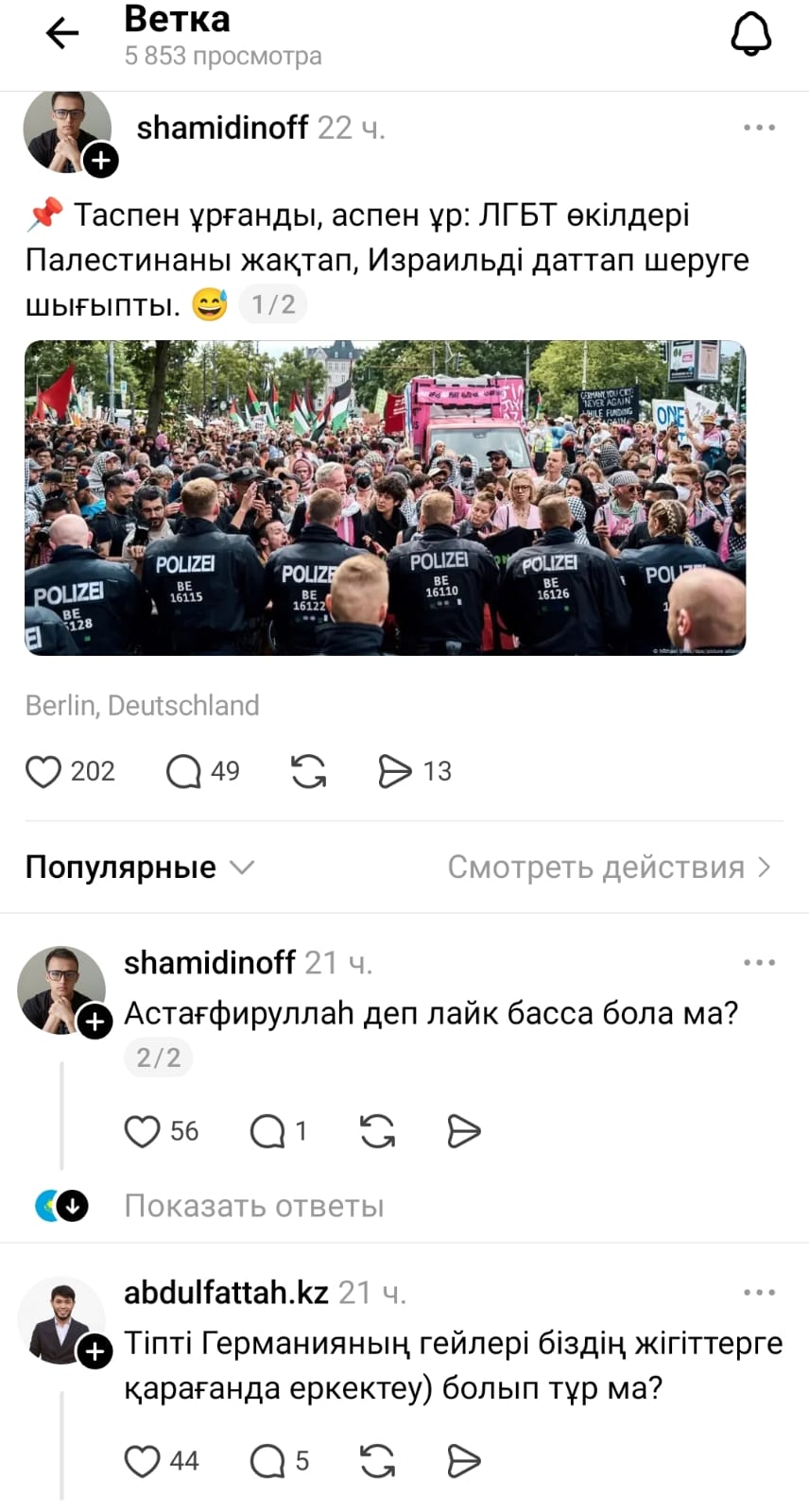 Шамиддиновтың жазуынша ЛГБТ өкілдері Палестина халқына қолдау көрсету мақсатында шеруге шығыпты.