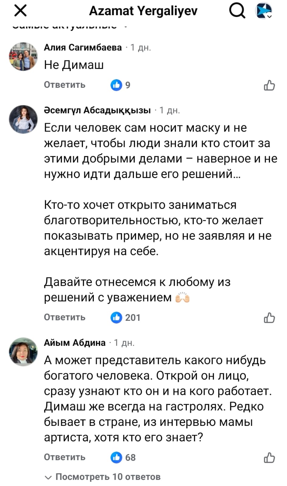 Қоғам белсендісінің бұл сұрауына өз пікірлерін жазған жүздеген кісінің бірі "иә, Димаш болуы мүмкін" десе, енді бірі өз болжамын айтуда.