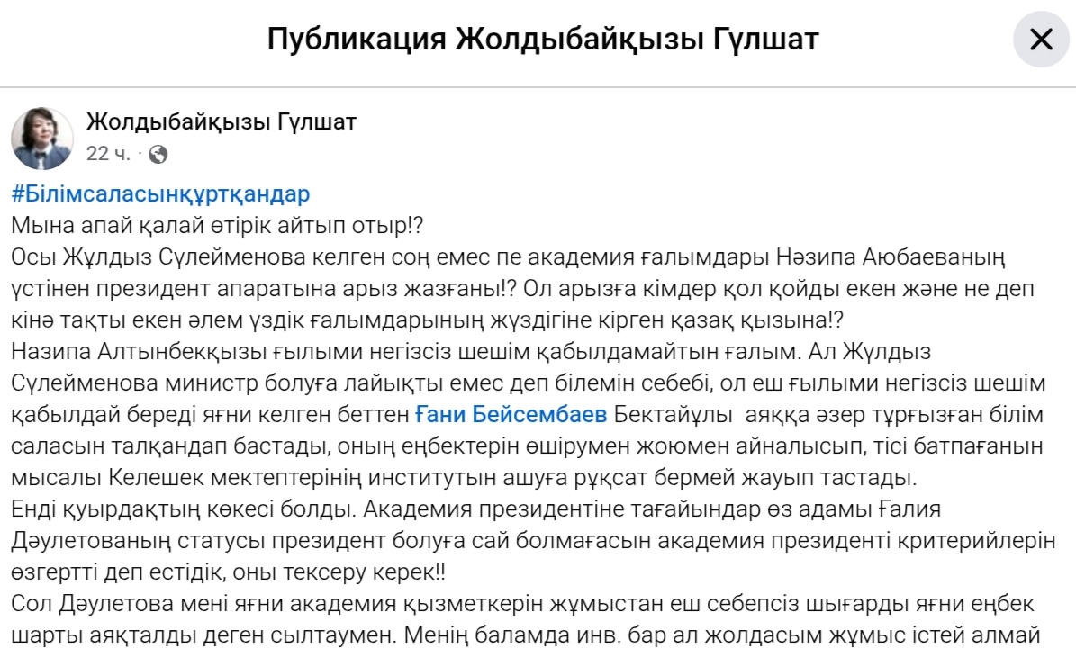 Ы.Алтынсарин атындағы ұлттық Академияның бұрынғы қызметкері Гүлшат Жолдыбайқызы өзінің әлеуметтік желідегі парақшасында Оқу ағарту министрі Жұлдыз Сүлейменованы "министр болуға лайық емес" деп жазба жариялады деп жазады Democrat.kz.