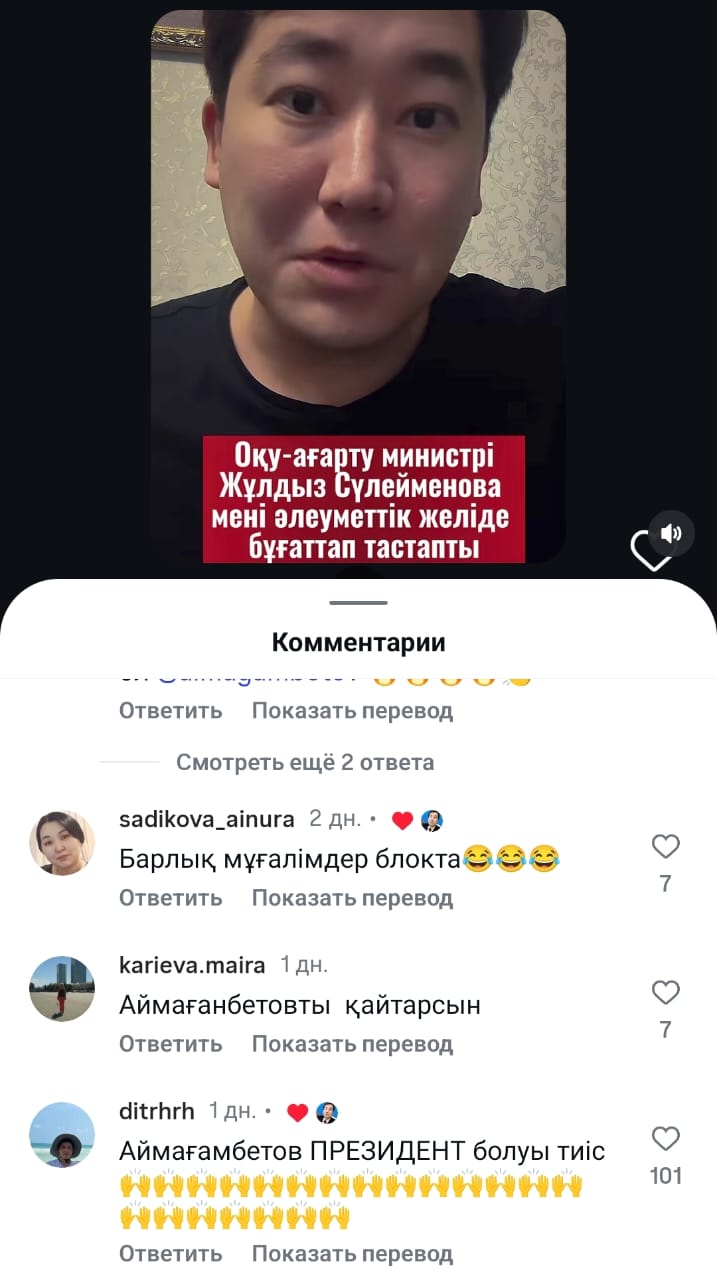 Блогердің бұл видеосына пікір жазған белсенді педагогтер мен желі қолданушы қарапайым азаматтар министр Жұлдыз Сүлейменованың әлеуметтік желіде өздерін блоктап тастағанын айтуда.