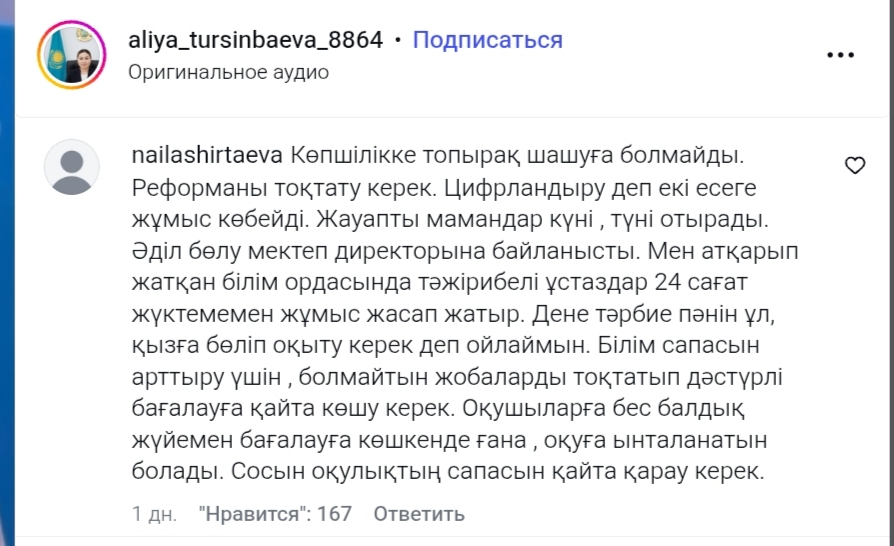 "Көпшілікке топырақ шашуға болмайды. Реформаны тоқтату керек. Цифрландыру деп екі есеге жұмыс көбейді. Жауапты мамандар күні , түні отырады. Әділ бөлу мектеп директорына байланысты. Мен атқарып жатқан білім ордасында тәжірибелі ұстаздар 24 сағат жүктемемен жұмыс жасап жатыр. Дене тәрбие пәнін ұл, қызға бөліп оқыту керек деп ойлаймын. Білім сапасын арттыру үшін , болмайтын жобаларды тоқтатып дәстүрлі бағалауға қайта көшу керек. Оқушыларға бес балдық жүйемен бағалауға көшкенде ғана , оқуға ынталанатын болады. Сосын оқулықтың сапасын қайта қарау керек."