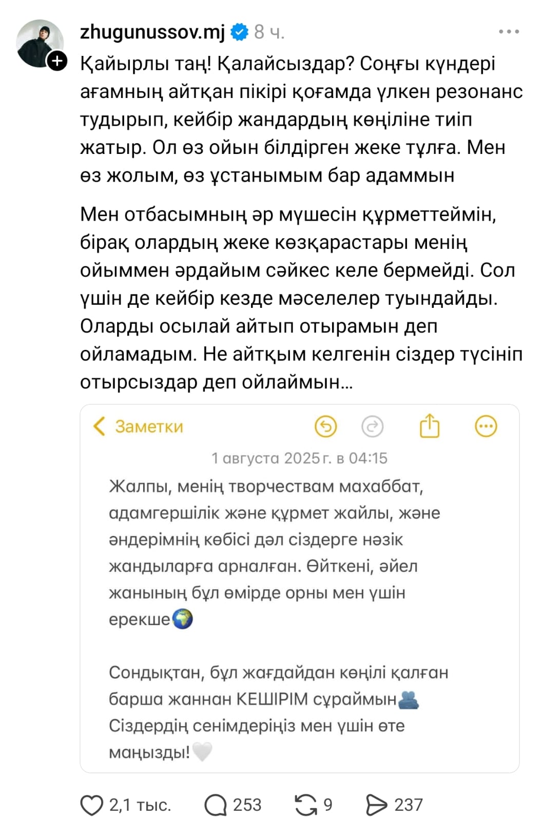 “Менің шығармашылығым адамға құрмет жайлы. Нәзік жандыларға арналған әндерім де бар. Өйткені әйел адамның орны менің өмірімде ерекше. Бұл жағдайдан көңілі қалған барша жаннан кешірім сұраймын. Сіздердің сенімдеріңіз мен үшін өте маңызды”, – деп жазды Мирас.