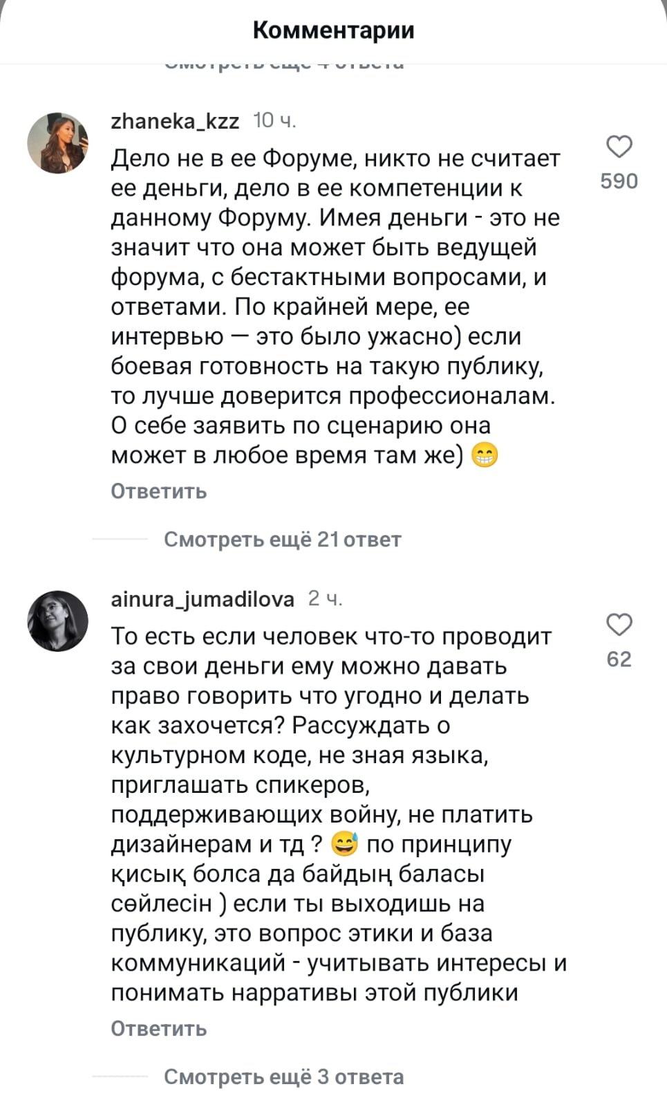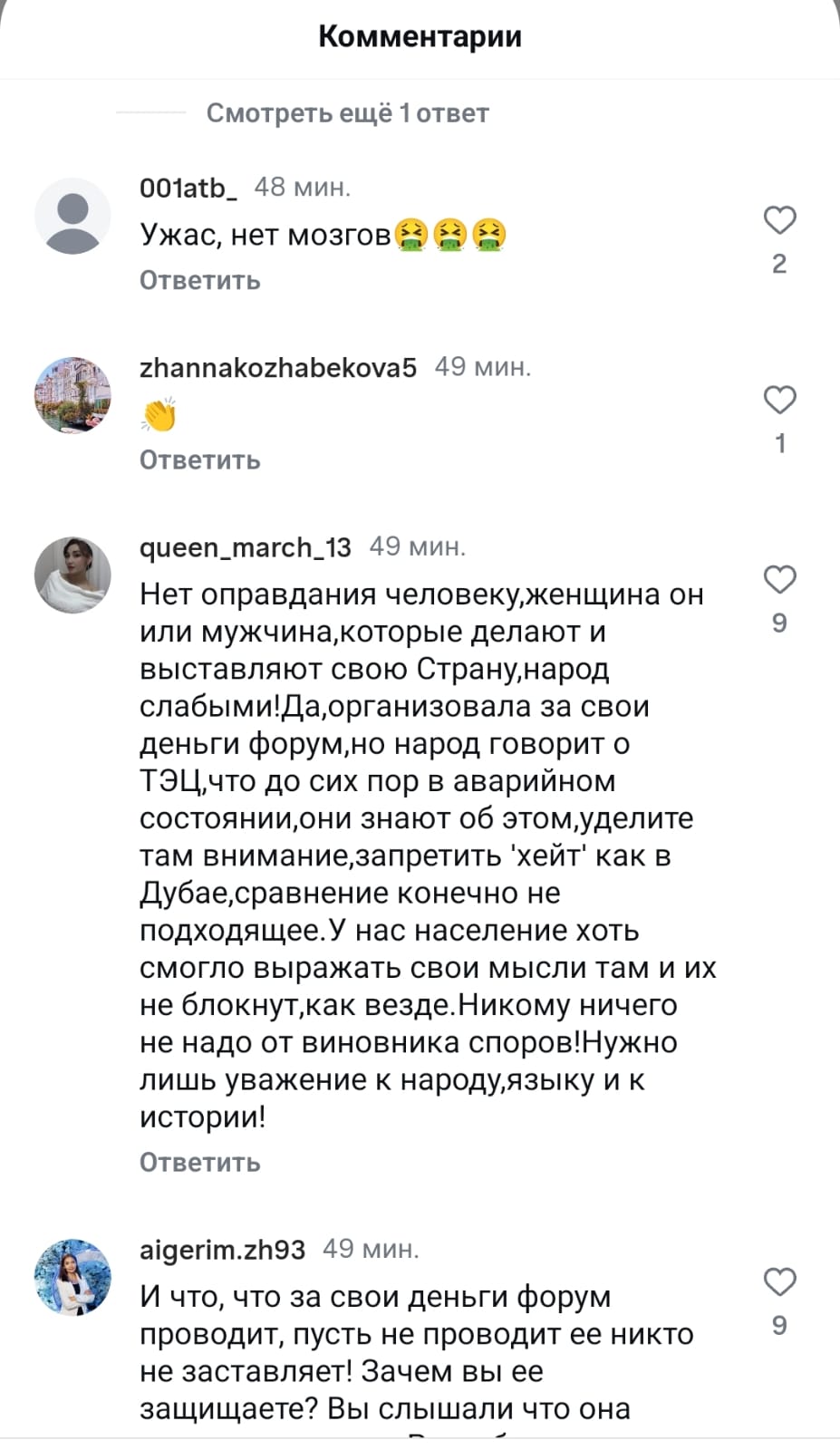 "Эмиратта хейт жазу елді іштен ірітетінін түсінді. Ал бізде әркім ойына келгенін жаза береді" деген Динара Сәтжан форум өткізуге әркімнің қақысы барын алға тартты.