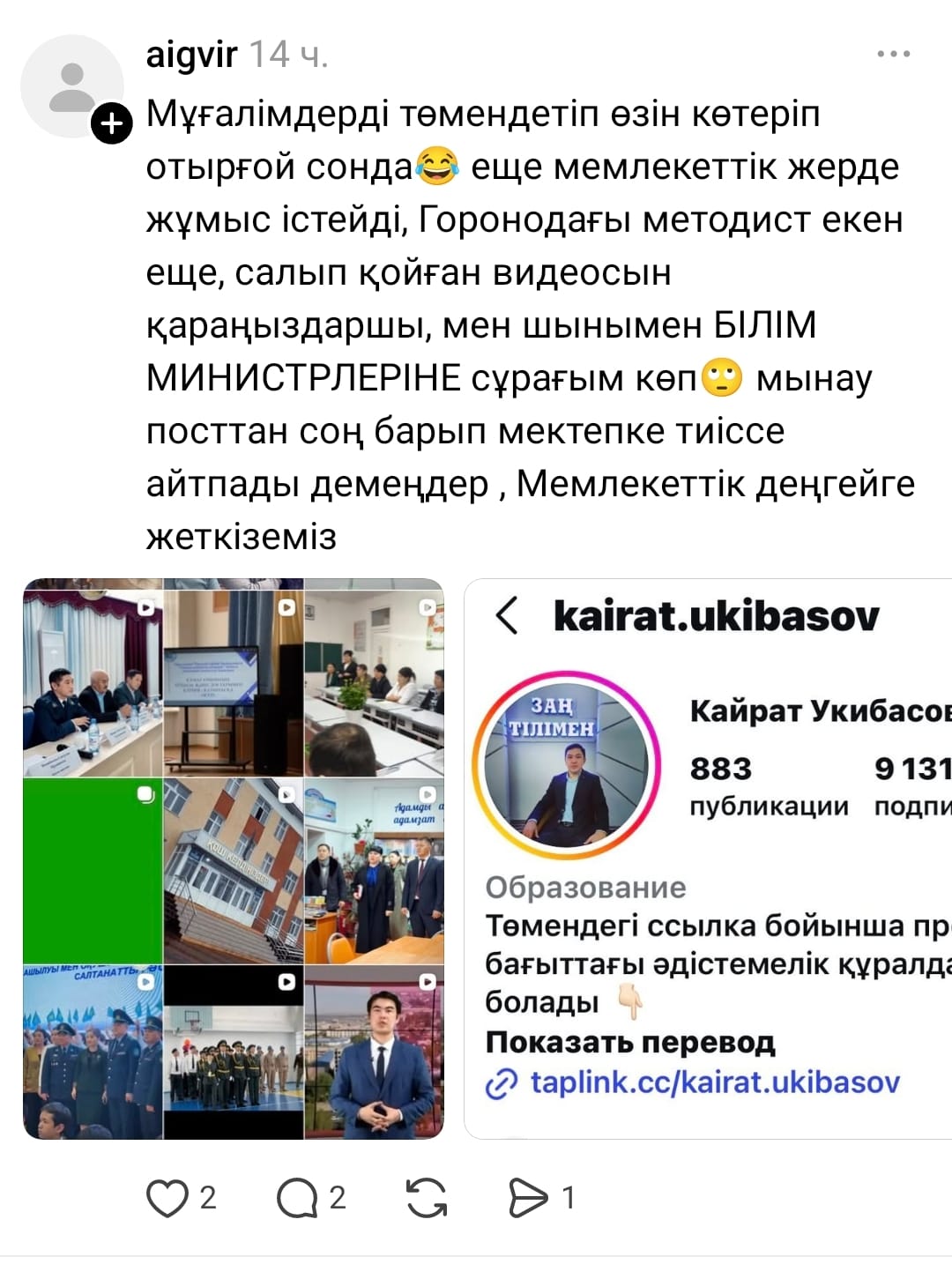 Мұғалімдерді төмендетіп өзін көтеріп отырғой сонда еще мемлекеттік жерде жұмыс істейді, Горонодағы методист екен еще, салып қойған видеосын қараңыздаршы, мен шынымен БІЛІМ МИНИСТРЛЕРІНЕ сұрағым көп мынау посттан соң барып мектепке тиіссе айтпады демеңдер , Мемлекеттік деңгейге жеткіземіз"деп жазба жариялап, фото, видео жариялады.