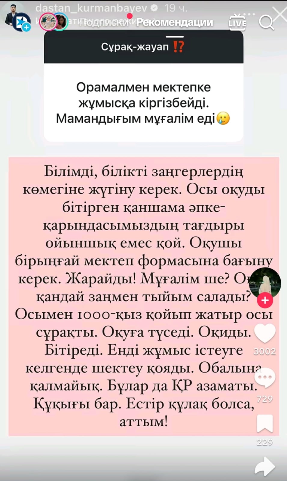 ТикТок әлеуметтік желісінде хиджаб киген қыздар алған білімі бойынша мұғалім бола алмай жүргендерін, хиджабпен мектепке кіргізбейтінін айтып наразылықтарын білдіруде деп жазады Democrat.kz.
