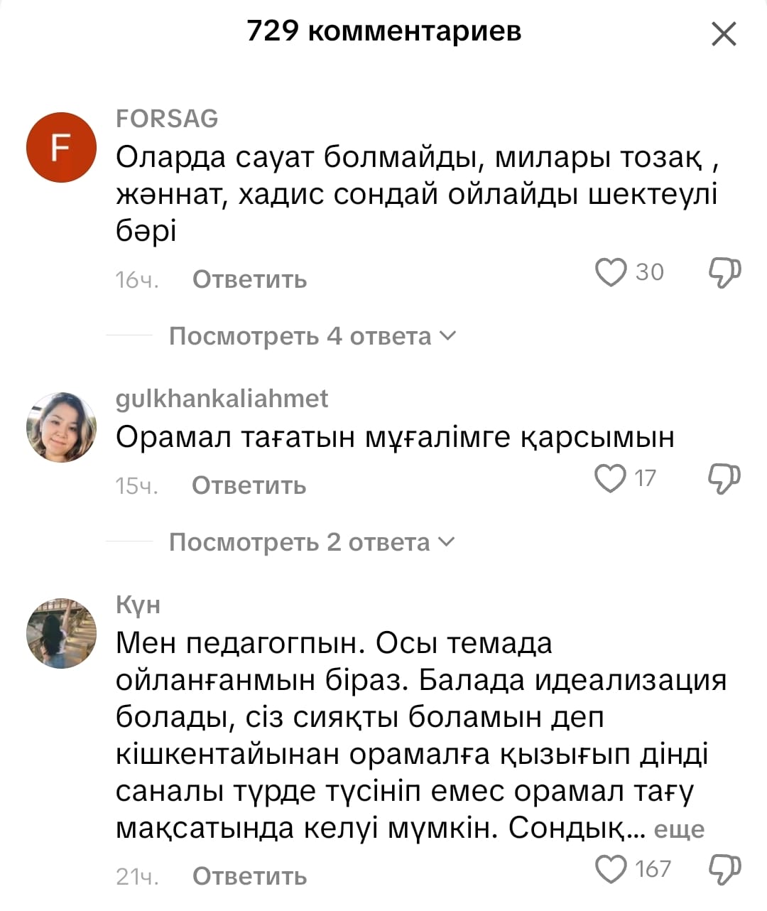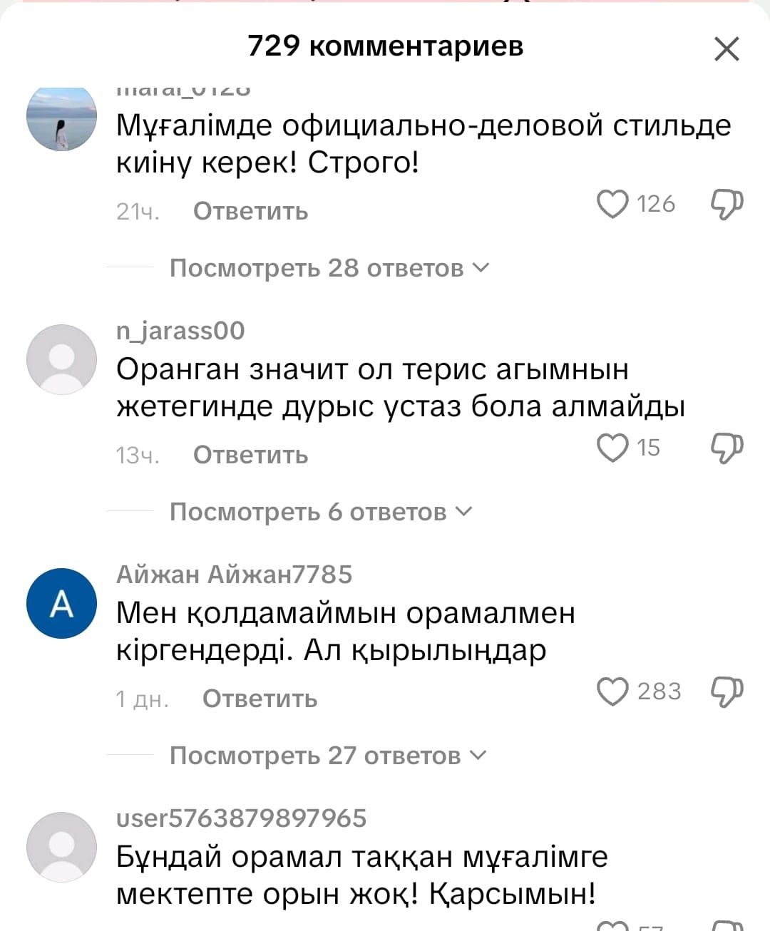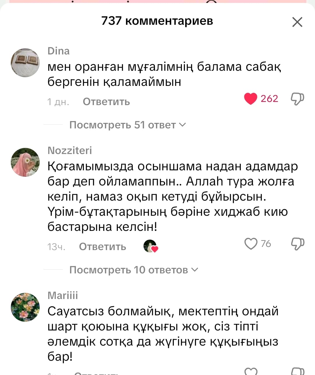 Әйтсе де, бұл жазбаға қатысты "мұғалімнің хиджаб киюін қолдамаймыз", "баламзға діндар адамның сабақ бергенін қаламаймыз" деген пікірлер көптеп жазылуда.