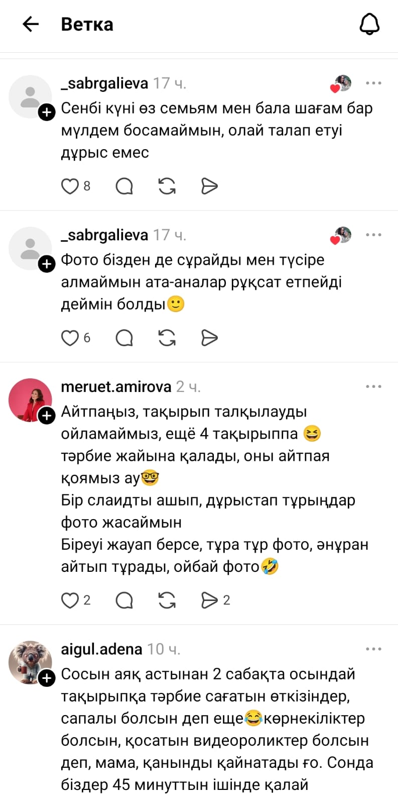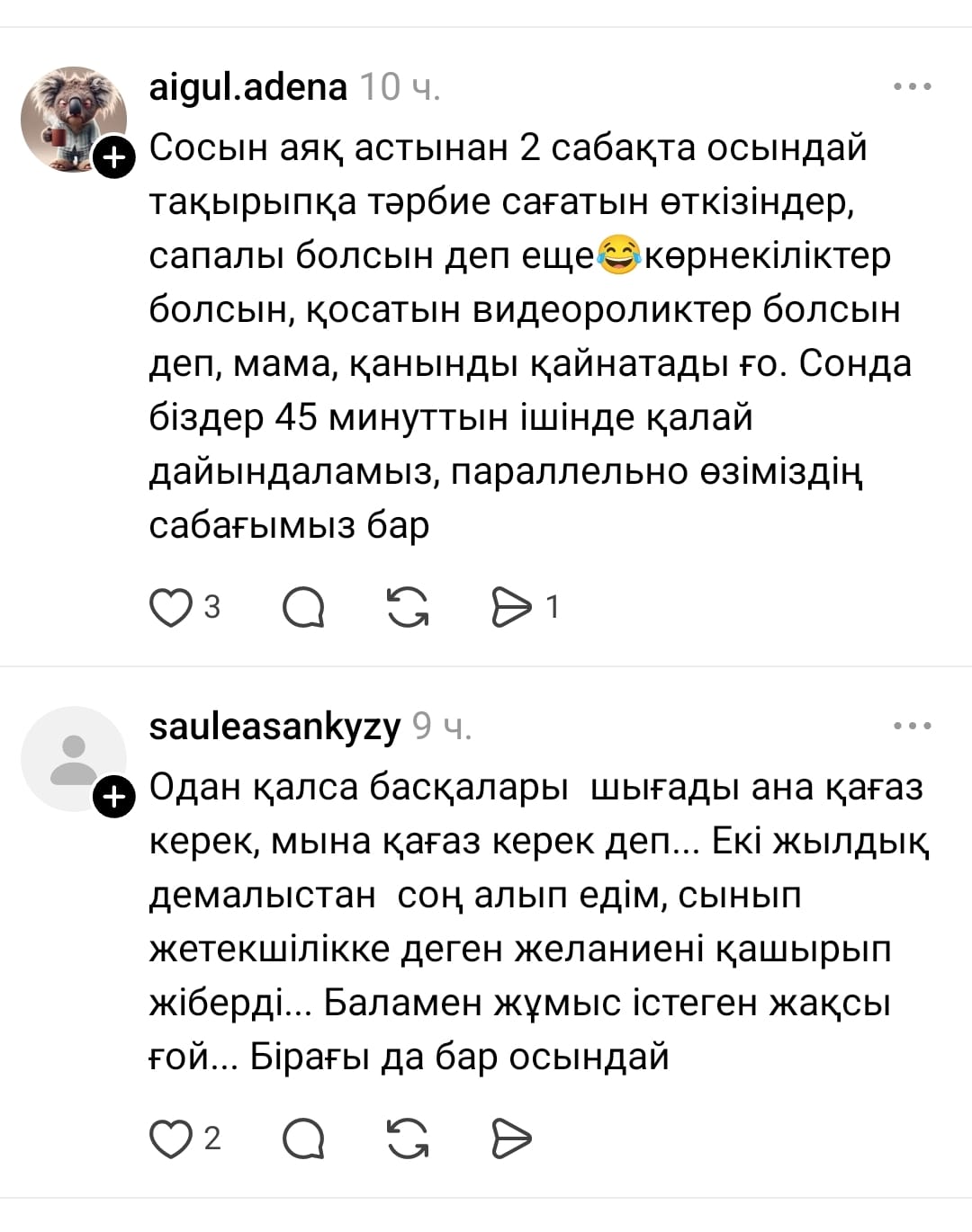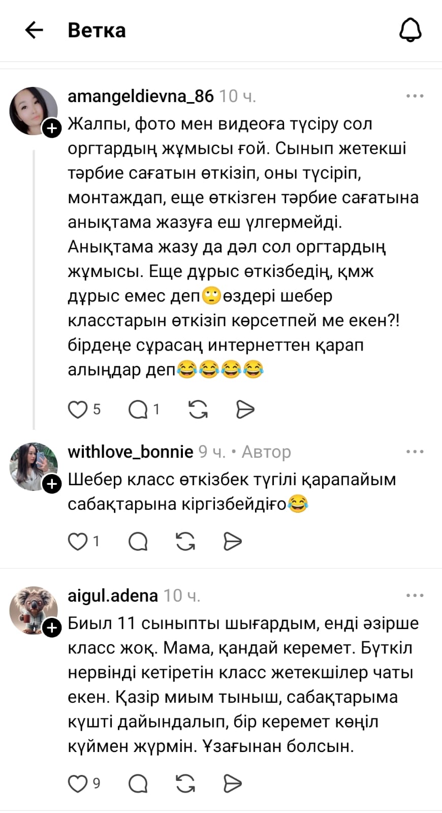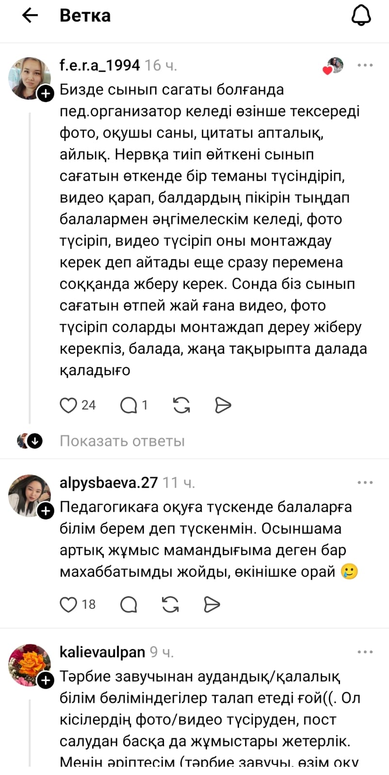 "Аймағамбетовтің жазбасынан кейін өз ойыммен бөліссем деп едім) Сынып жетекші болғанымда бізге тәрбие жөнінде орынбасарының берген орынсыз тапсырмалары жыл бойы жүйкемді жұқартып еді. Кейбіреуін атап айтатын болсам: жүргізген сынып сағаттар, тәрбие сағаттарды видео суретке түсіріп инстаграмдағы мектептің парақшасына салу;
